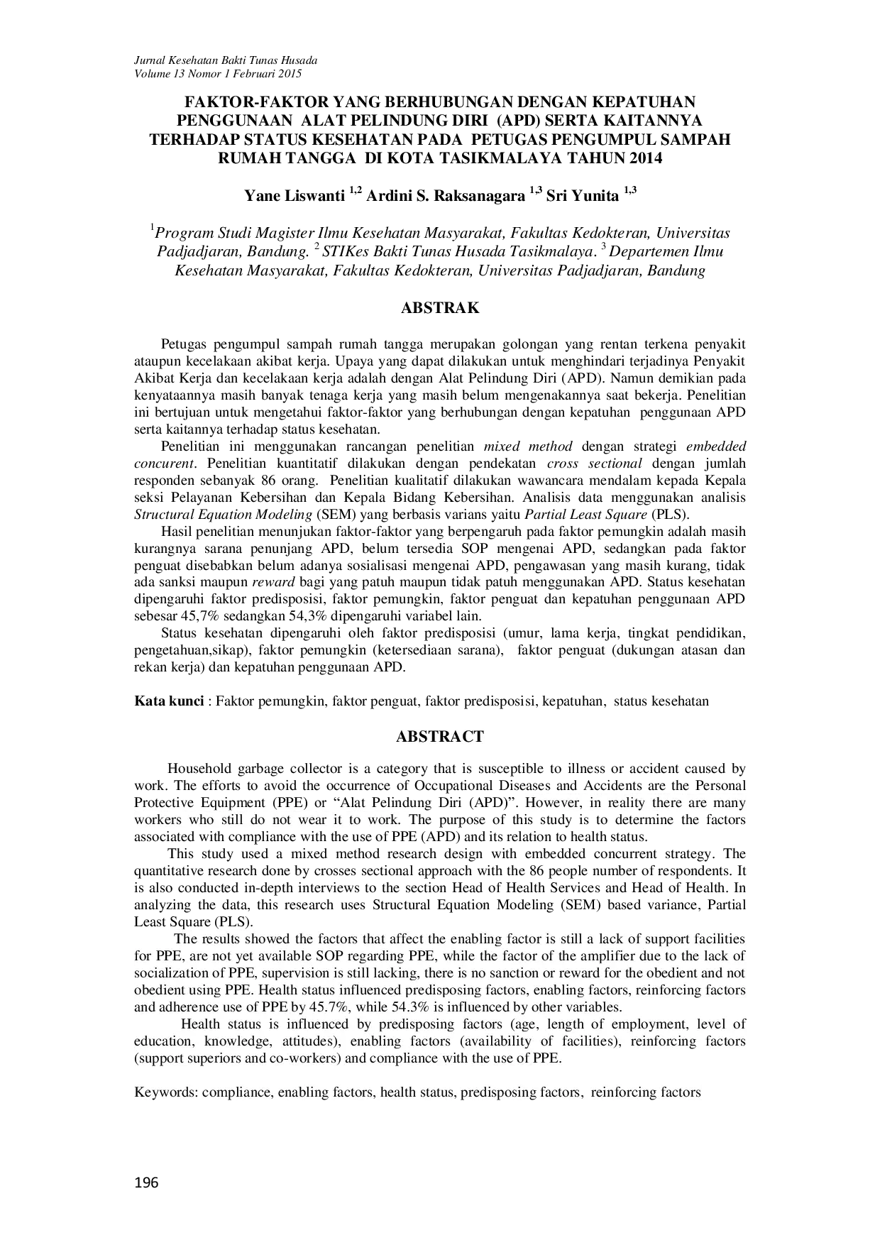 Jurnal Kesehatan Bakti Tunas Husada: Jurnal Ilmu-ilmu Keperawatan, Analis Kesehatan dan FarmasiJurnal Kesehatan Bakti Tunas Husada: Jurnal Ilmu-ilmu Keperawatan, Analis Kesehatan dan FarmasiPetugas pengumpul sampah rumah tangga merupakan golongan yang rentan terkena penyakit ataupun kecelakaan akibat kerja. Upaya yang dapat dilakukan untuk menghindari terjadinya Penyakit Akibat Kerja dan kecelakaan kerja adalah dengan Alat Pelindung Diri (APD). Namun demikian pada kenyataannya masih banyak tenaga kerja yang masih belum mengenakannya saat bekerja. Penelitian ini bertujuan untuk mengetahui faktor-faktor yang berhubungan dengan kepatuhan penggunaan APD serta kaitannya terhadap status kesehatan. Penelitian ini menggunakan rancangan penelitian mixed method dengan strategi embedded concurent. Penelitian kuantitatif dilakukan dengan pendekatan cross sectional dengan jumlah responden sebanyak 86 orang. Penelitian kualitatif dilakukan wawancara mendalam kepada Kepala seksi Pelayanan Kebersihan dan Kepala Bidang Kebersihan. Analisis data menggunakan analisis Structural Equation Modeling (SEM) yang berbasis varians yaitu Partial Least Square (PLS). Hasil penelitian menunjukkan faktor-faktor yang berpengaruh pada faktor pemungkin adalah masih kurangnya sarana penunjang APD, belum tersedia SOP mengenai APD, sedangkan pada faktor penguat disebabkan belum adanya sosialisasi mengenai APD, pengawasan yang masih kurang, tidak ada sanksi maupun reward bagi yang patuh maupun tidak patuh menggunakan APD. Status kesehatan dipengaruhi faktor predisposisi, faktor pemungkin, faktor penguat dan kepatuhan penggunaan APD sebesar 45,7% sedangkan 54,3% dipengaruhi variabel lain.