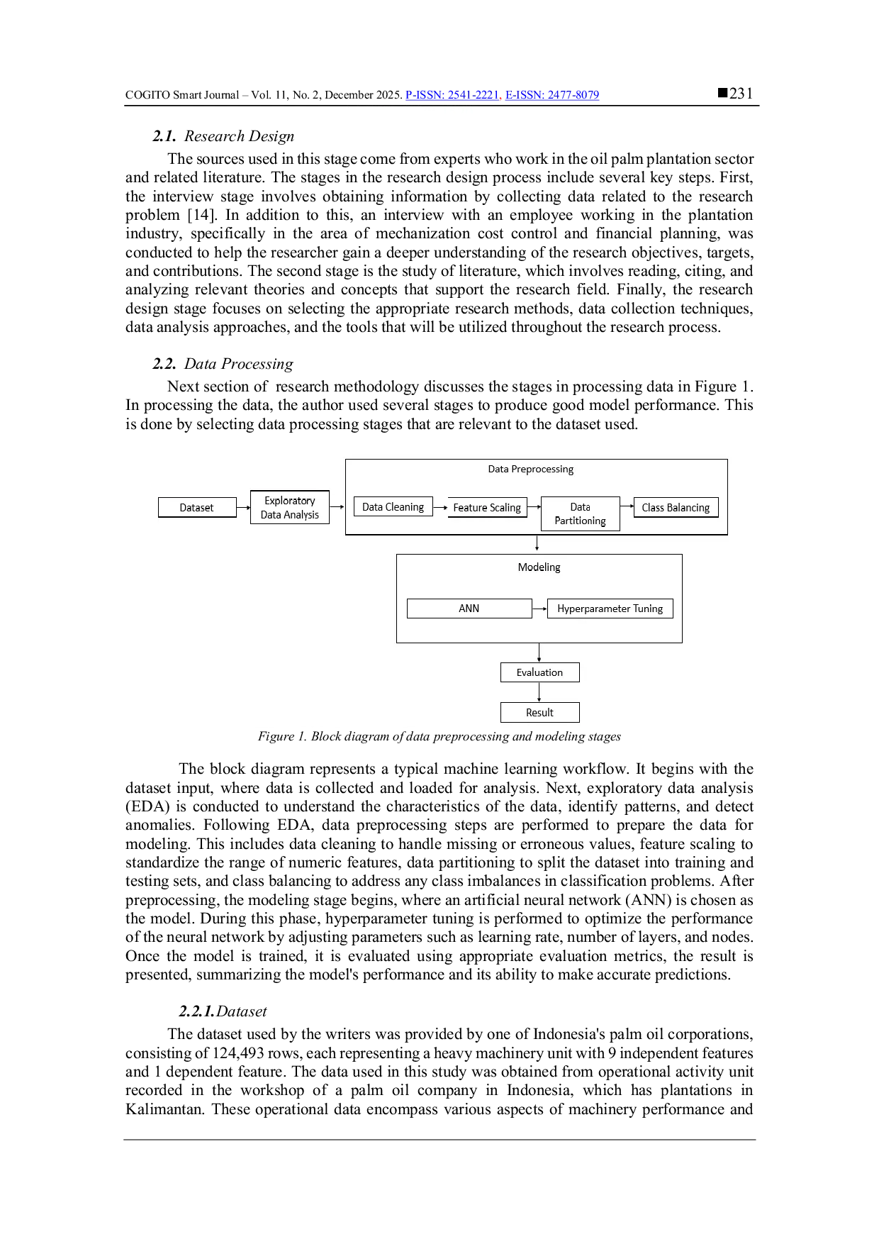 CogITo Smart JournalCogITo Smart JournalPenelitian ini bertujuan untuk mengurangi kesalahan manusia dalam pemilihan mesin untuk pemeliharaan prediktif menggunakan deep learning. Dataset yang digunakan dalam penelitian ini adalah data operasional mesin alat berat dari salah satu perusahaan kelapa sawit di Indonesia dengan 9 fitur independen dan 1 fitur dependen. Fitur dependen adalah fitur target yang berisi dua kelas target yang mewakili mesin yang efektif dan tidak efektif. Dataset dalam penelitian ini mengandung outlier, skala fitur yang sangat berbeda, dan kelas data tidak seimbang. Untuk menangani outlier dan menstandarisasi skala data, metode Z-score digunakan. Sementara itu, metode over sampling digunakan untuk menangani kelas data tidak seimbang. Untuk memperoleh kinerja model terbaik, jumlah epoch dan dua jenis optimizer (adam & adamax) dari neural network dipilih. Dalam memilih jumlah epoch, eksperimen dilakukan menggunakan 100 epoch. Penelitian ini memperoleh hubungan linearitas antara jumlah epoch dan akurasi dengan nilai akurasi menggunakan optimizer Adam dan Adamax adalah 94,82% dan 93,11% pada epoch ke-100.