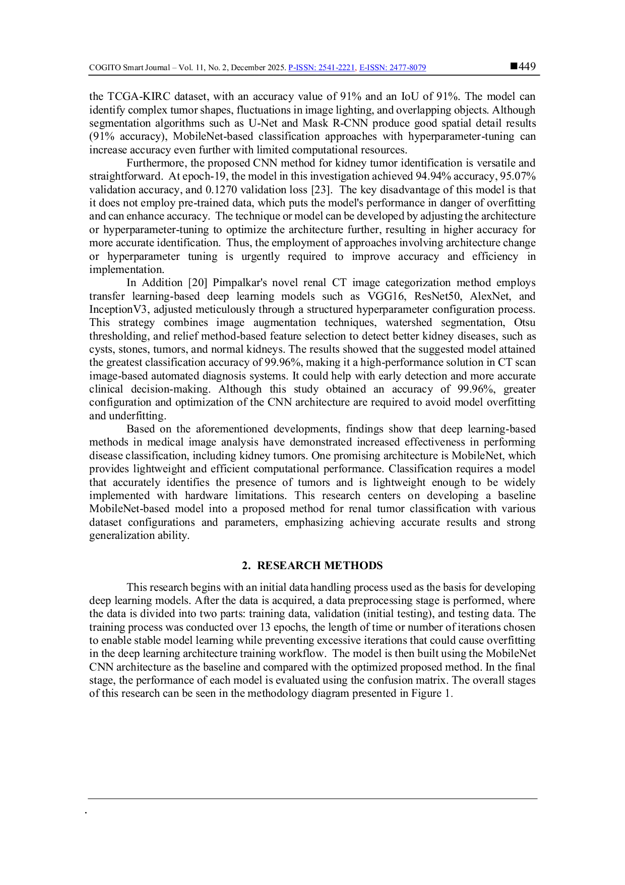 CogITo Smart JournalCogITo Smart JournalFokus utama penelitian ini adalah mengembangkan arsitektur MobileNet untuk menghasilkan model klasifikasi tumor ginjal yang akurat, tahan terhadap overfitting, dan tetap konsisten dengan variasi dataset serta parameter pelatihan. Studi ini bertujuan untuk mengembangkan arsitektur MobileNet guna menghasilkan model perangkat lunak yang dapat mengidentifikasi secara tepat dengan akurasi tinggi, melakukan klasifikasi tumor ginjal, dan menghindari kegagalan dalam menggeneralisasi data baru yang disebut overfitting, serta mengevaluasi perbedaan akurasi yang dihasilkan dari beberapa variasi dataset dan parameter. Metode yang digunakan dalam penelitian ini adalah MobileNet dengan penyetelan hyperparameter (hyperparameter tuning) dan fine-tuning, yang kemudian dibandingkan dengan metode MobileNet Baseline. Dataset terdiri dari 12.446 gambar yang diklasifikasikan sebagai Normal, Kista, Batu, dan Tumor, yang dikumpulkan dari Kaggle. Temuan penelitian ini pada pembagian data gambar rasio 80:10:10 dari metode yang diusulkan menghasilkan akurasi 100%, presisi 100%, recall 100%, dan F1-Score 100%. Studi ini diharapkan dapat menghasilkan modifikasi arsitektur yang mampu mengklasifikasikan tumor ginjal dengan akurasi tinggi, sehingga hipotesis dapat tercapai. Selain itu, berbagai pendekatan dalam analisis citra medis menggunakan deep learning telah menunjukkan hasil yang lebih baik dalam mengidentifikasi berbagai tumor, khususnya dalam penelitian ini, dalam klasifikasi dan deteksi tumor ginjal.