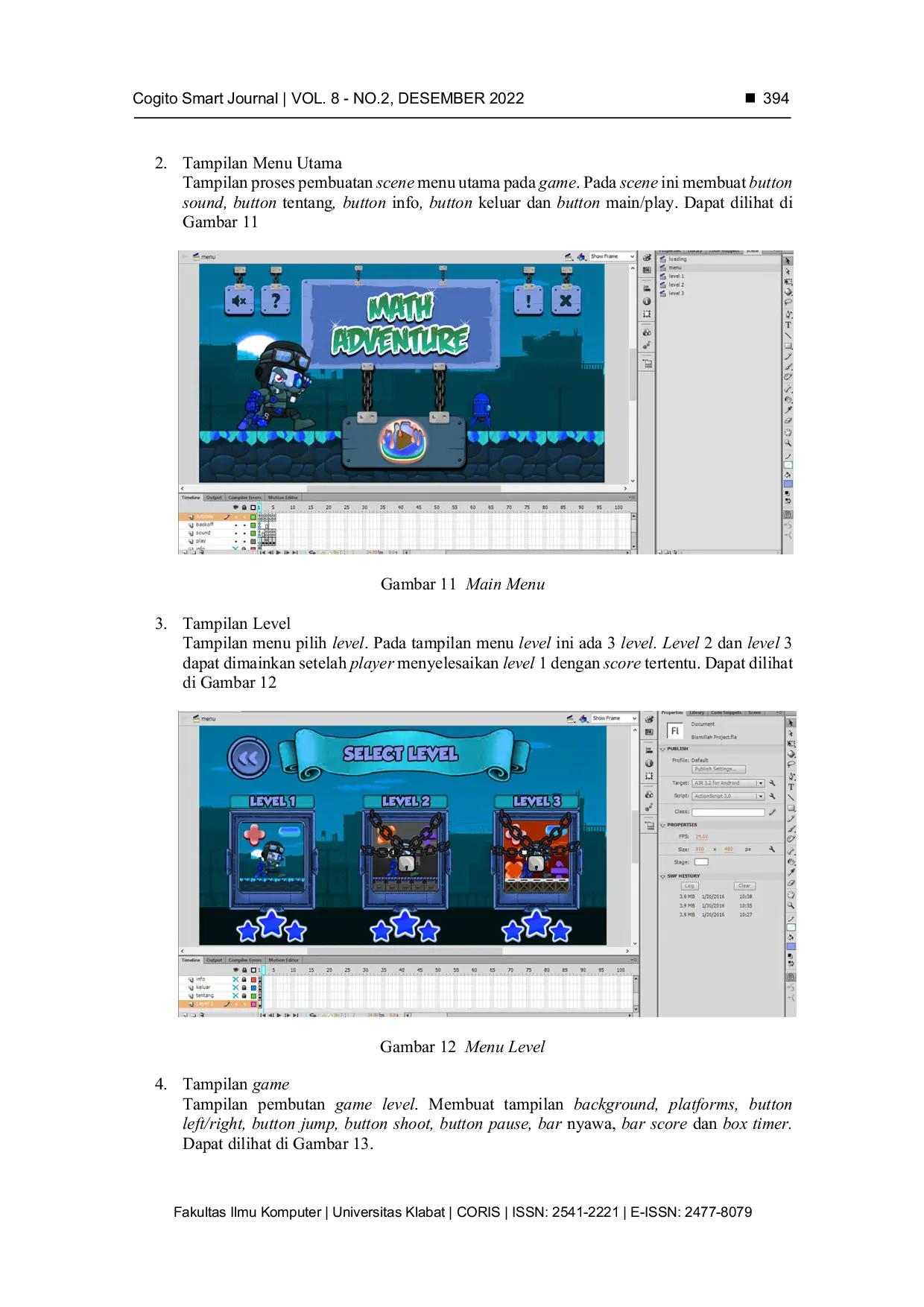 CogITo Smart JournalCogITo Smart JournalBeberapa penelitian mengenai pemilihan model pembelajaran bertema game disimpulkan dapat menghilangkan kejenuhan dalam proses pembelajaran, sehingga siswa antusias dan berperan aktif mengikuti pelajaran. Pembelajaran bertema game ini disebut Game-based learning, yaitu metode pembelajaran yang memiliki konsep menggabungkan konten pendidikan atau prinsip-prinsip belajar dengan game yang bertujuan untuk menarik siswa untuk belajar. Dalam perancangan Game-based learning, tentunya harus terstruktur dan terkonsep dengan baik, serta memenuhi standar penerapan konsep game ke dalam pembelajaran. Metode yang bisa merekam dan mendokumentasikan setiap detail dari desain gameplay dan perancangan Game-based learning adalah Game Design Document (GDD), yaitu dokumen yang berisi informasi secara detail dan terperinci mengenai pengembangan sebuah Game-based learning yang bertujuan untuk memberikan kemudahan antar bagian dalam perancangan game, mulai dari Game Artist, Sound Engineer, Game Designer, Software Engineer dan Game Tester. Penelitian ini bertujuan untuk mengimplementasikan GDD dalam perancangan Game-based learning, dengan menggunakan metode Multimedia Development Life Cycle (MDLC). Diharapkan penelitian ini dapat menghasilkan kesimpulan mengenai standar perancangan pembelajaran berbasis game yang terdokumentasi dalam GDD.