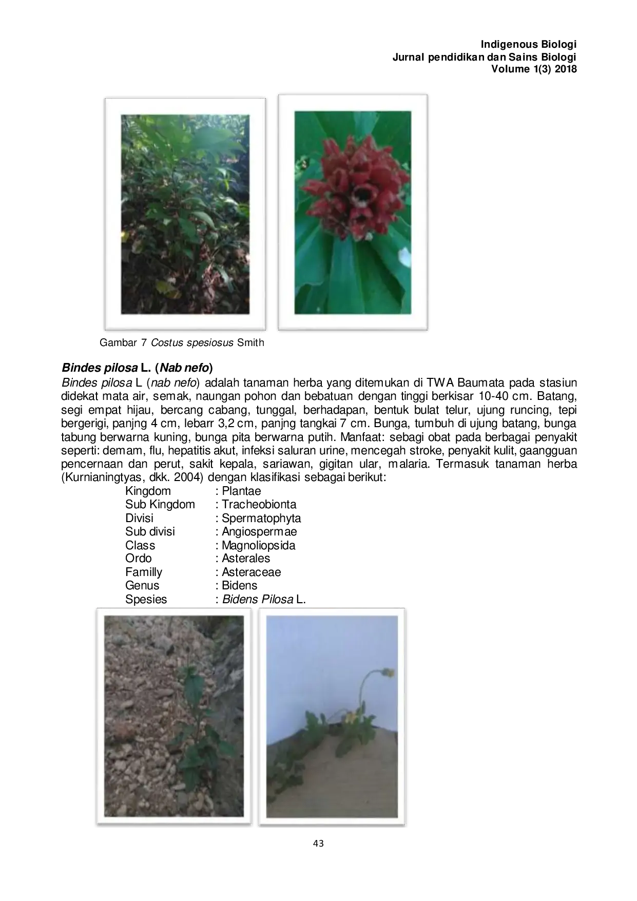 INDIGENOUS BIOLOGI : JURNAL PENDIDIKAN DAN SAINS BIOLOGIINDIGENOUS BIOLOGI : JURNAL PENDIDIKAN DAN SAINS BIOLOGITaman Wisata Alam Baumata (TWA) adalah salah satu tempat wisata alam yang terletak di Desa Baumata Kecamatan Taebenu, berjarak 16 Km dari Kota Kupang. TWA Baumata merupakan hutan hujan tropik dataran rendah dengan berbagai macam flora dan fauna. Herba adalah tumbuhan pendek dengan tinggi 0,3-2 meter dan berbatang basah karena banyak mengandung air. Penelitian ini menggunakan metode kombinasi transek bergaris dan kuadran pada 4 stasiun: dekat mata air, rerumputan/semak, tegakan pohon, dan bebatuan. Hasil penelitian menunjukkan terdapat 7 famili dan 8 spesies tanaman herba, yaitu famili Asteraceae (Syenedrella nodiflora L, Bindes pilosa L), Amaranthaceae (Amaranthus viridis L), Portulaceae (Portulaca oleraceae L), Euphorbiaceae (Euphorbia hirta L), Polypodiaceae (Pityrograma colemelanus L), Costaceae (Costus spesiosus Smith), dan Araceae (Homalomena occulta L), dengan total 329 individu. Indeks keanekaragaman pada semua stasiun menunjukkan keanekaragaman sedang.