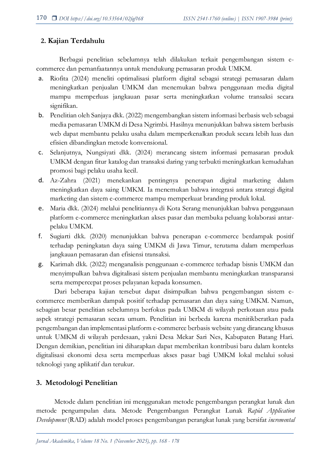 JURNAL AKADEMIKAJURNAL AKADEMIKAProduk UMKM Desa Mekar Sari Nes Kabupaten Batang Hari menyediakan penjualan produk yang dihasilkan oleh penyedia produk UMKM. Pelayanan penjualan menjadi krusial seiring dengan meningkatnya persaingan antar bisnis. Oleh karena itu, pengembangan sistem E-commerce penjualan untuk memfasilitasi pelayanan kepada konsumen terus dilakukan. Penelitian ini bertujuan untuk membangun platform E-commerce berbasis web untuk produk UMKM Desa Mekar Sari Nes, guna mengatasi kendala pemasaran tradisional seperti keterbatasan jangkauan, minimnya promosi digital, dan ketergantungan pada penjualan langsung. Metode penelitian yang digunakan adalah pengembangan sistem informasi, meliputi analisis kebutuhan, perancangan, implementasi, pengujian, dan evaluasi. Proses yang dilakukan mencakup manajemen data produk, pemrosesan pesanan, pembayaran, dan notifikasi. Output yang dihasilkan berupa laporan penjualan, dashboard pemantauan, dan riwayat transaksi. Hasil penelitian menghasilkan website E-commerce yang telah teruji fungsionalitas fitur intinya, seperti pendaftaran pengguna, manajemen produk, proses checkout, dan pembayaran. Platform ini siap diimplementasikan untuk mendukung perluasan jangkauan pasar, peningkatan promosi digital, serta pengurangan ketergantungan pada penjualan langsung bagi UMKM Desa Mekar Sari Nes.