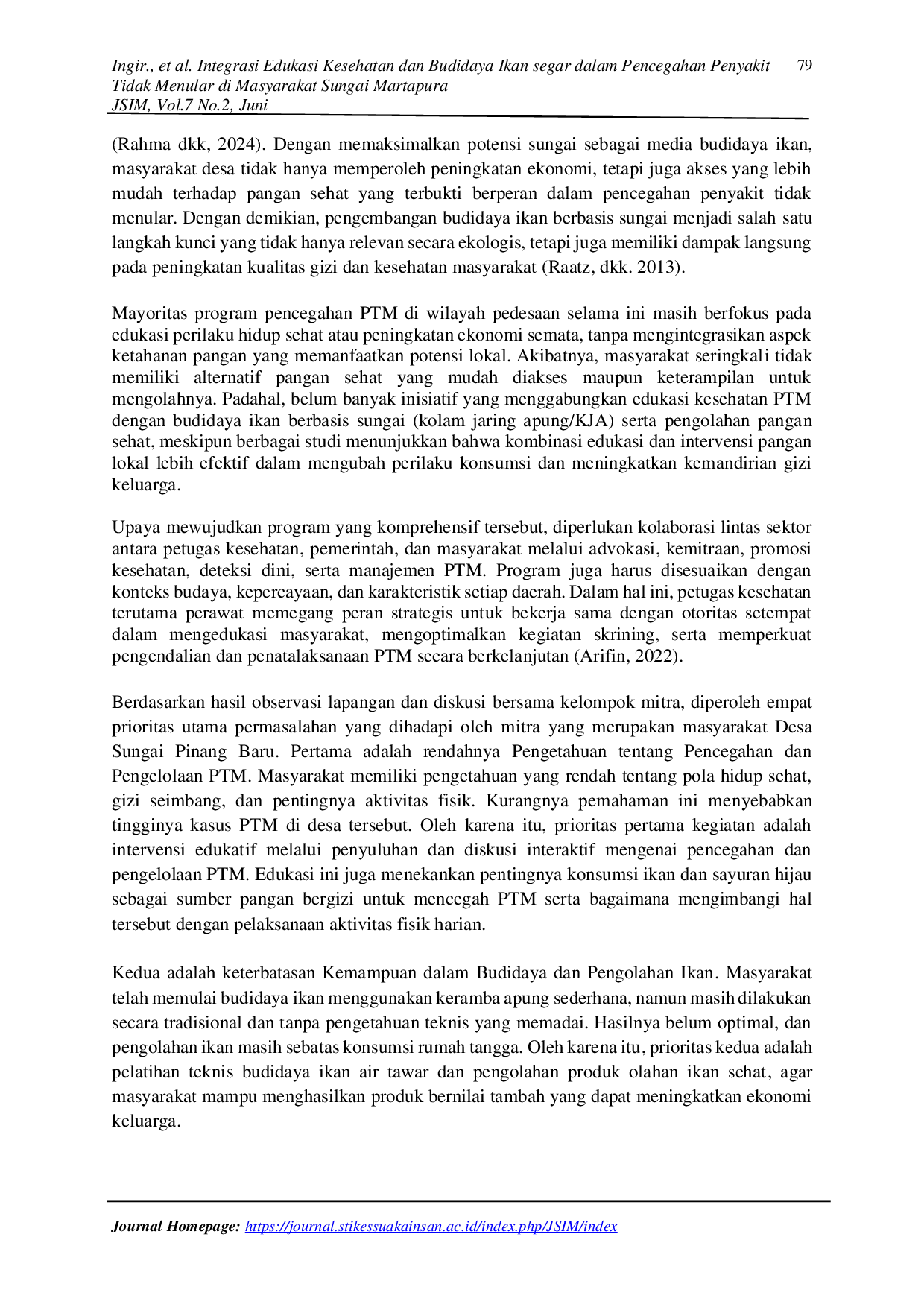 JURNAL SUAKA INSAN MENGABDI (JSIM)JURNAL SUAKA INSAN MENGABDI (JSIM)Penyakit Tidak Menular (PTM) masih menjadi masalah kesehatan utama di masyarakat, terutama akibat rendahnya konsumsi pangan bergizi dan protein hewani. Kegiatan pengabdian kepada masyarakat ini bertujuan meningkatkan kesadaran dan keterampilan warga Desa Sungai Pinang Baru dalam pencegahan PTM melalui edukasi kesehatan dan budidaya ikan segar dengan sistem keramba apung di Sungai Martapura. Metode kegiatan meliputi penyuluhan, pelatihan teknis, pemasangan keramba, penebaran benih ikan patin dan nila, serta pendampingan lapangan. Hasil menunjukkan peningkatan pengetahuan masyarakat tentang pencegahan PTM dari 33,3% menjadi 80%, dan pengetahuan budidaya ikan dari 38% menjadi 83%. Sebanyak 10 unit keramba apung berhasil dipasang dengan keterlibatan aktif kader Desa Sehat dan Karang Taruna. Program ini terbukti meningkatkan kesadaran gizi, keterampilan budidaya ikan, serta membuka peluang ekonomi baru bagi masyarakat pinggiran sungai. Pendekatan integratif ini diharapkan menjadi model pemberdayaan masyarakat berbasis kesehatan dan ketahanan pangan lokal yang berkelanjutan.