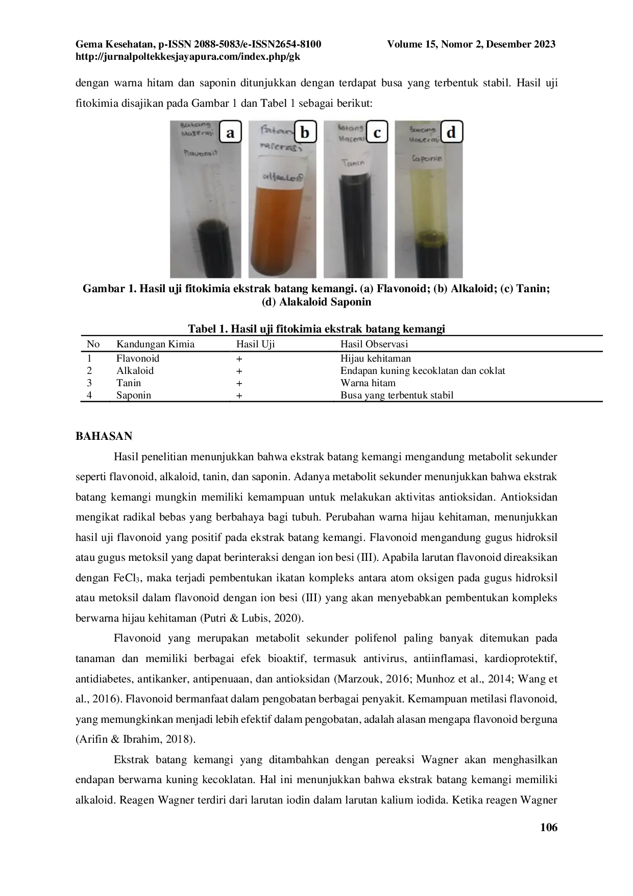 Hasil uji fitokimia pada ekstrak batang kemangi menunjukkan bahwa terdapat senyawa aktif flavonoid, alkaloid, saponin dan tanin sebagai metabolit sekunder yang memiliki potensi yang kuat untuk pengobatan.Flavonoid memiliki aktivitas antioksidan, antiinfamasi dan antikanker.Alkaloid memiliki akivitas sebagai analgesik, antispasmodik, atau antikanker.Saponin memiliki sifat antiinflamasi, imunomodulasi, dan antikanker.Tanin memiliki sifat antiseptik, antiinflamasi, dan astringen.Penelitian selanjutnya disarankan untuk menambahkan uji fitokimia ekstrak batang kemangi secara kuantitatif.