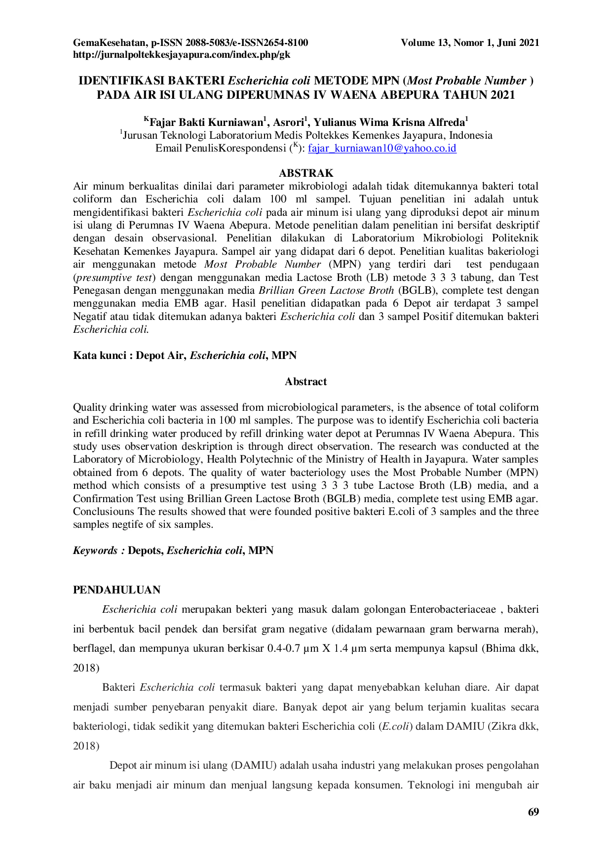 gema kesehatangema kesehatanAir minum berkualitas dinilai dari parameter mikrobiologi adalah tidak ditemukannya bakteri total coliform dan Escherichia coli dalam 100 ml sampel. Tujuan penelitian ini adalah untuk mengidentifikasi bakteri Escherichia coli pada air minum isi ulang yang diproduksi depot air minum isi ulang di Perumnas IV Waena Abepura. Metode penelitian dalam penelitian ini bersifat deskriptif dengan desain observasional. Penelitian dilakukan di Laboratorium Mikrobiologi Politeknik Kesehatan Kemenkes Jayapura. Sampel air yang didapat dari 6 depot. Penelitian kualitas bakteriologi air menggunakan metode Most Probable Number (MPN) yang terdiri dari test pendugaan (presumptive test) dengan menggunakan media Lactose Broth (LB) metode 3 3 3 tabung, dan Test Penegasan dengan menggunakan media Brillian Green Lactose Broth (BGLB), complete test dengan menggunakan media EMB agar. Hasil penelitian didapatkan pada 6 Depot air terdapat 3 sampel Negatif atau tidak ditemukan adanya bakteri Escherichia coli dan 3 sampel Positif ditemukan bakteri Escherichia coli.