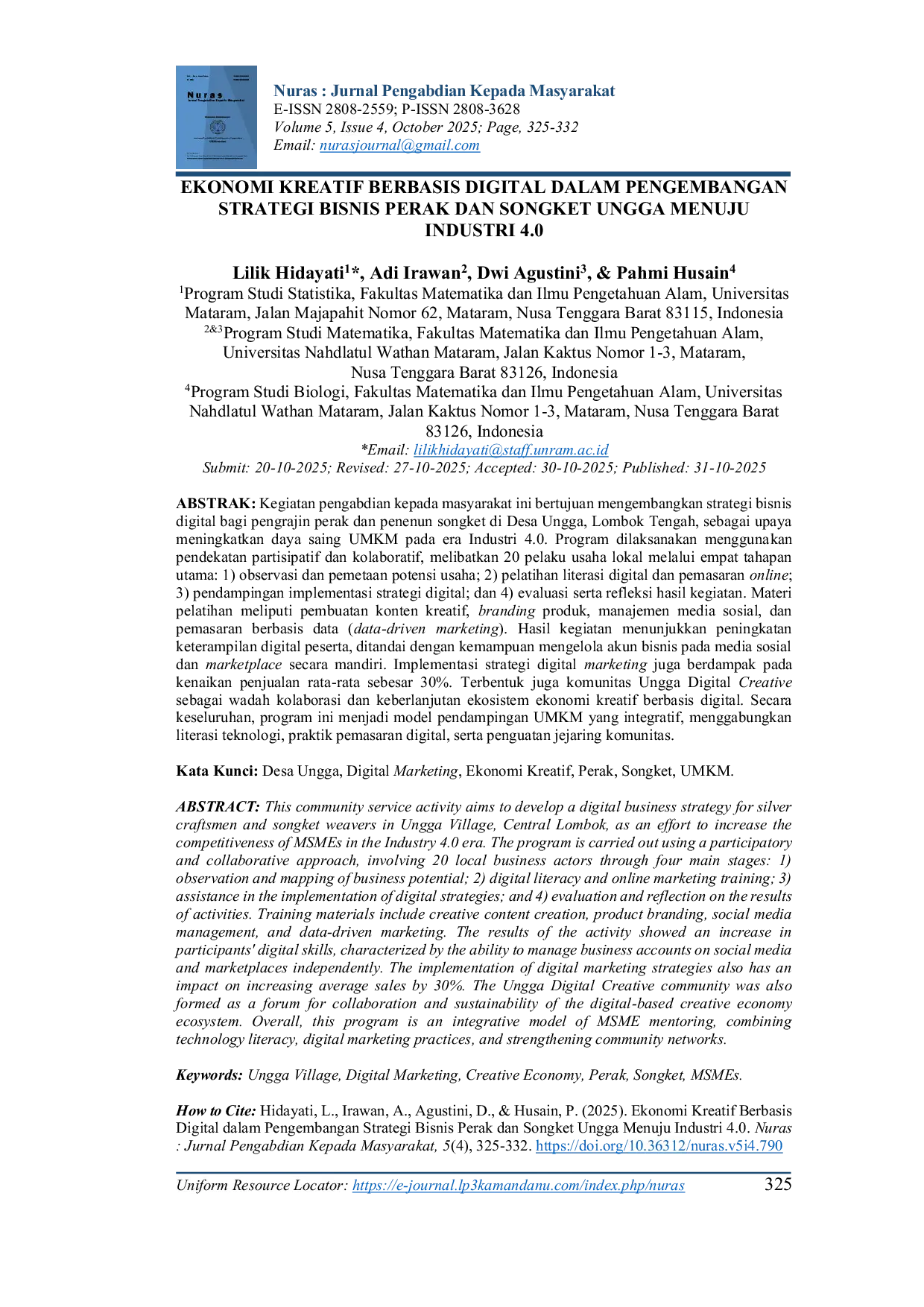 Nuras : Jurnal Pengabdian Kepada MasyarakatNuras : Jurnal Pengabdian Kepada MasyarakatKegiatan pengabdian kepada masyarakat ini bertujuan mengembangkan strategi bisnis digital bagi pengrajin perak dan penenun songket di Desa Ungga, Lombok Tengah, sebagai upaya meningkatkan daya saing UMKM pada era Industri 4.0. Program dilaksanakan menggunakan pendekatan partisipatif dan kolaboratif, melibatkan 20 pelaku usaha lokal melalui empat tahapan utama: 1) observasi dan pemetaan potensi usaha; 2) pelatihan literasi digital dan pemasaran online; 3) pendampingan implementasi strategi digital; dan 4) evaluasi serta refleksi hasil kegiatan. Materi pelatihan meliputi pembuatan konten kreatif, branding produk, manajemen media sosial, dan pemasaran berbasis data (data-driven marketing). Hasil kegiatan menunjukkan peningkatan keterampilan digital peserta, ditandai dengan kemampuan mengelola akun bisnis pada media sosial dan marketplace secara mandiri. Implementasi strategi digital marketing juga berdampak pada kenaikan penjualan rata-rata sebesar 30%. Terbentuk juga komunitas Ungga Digital Creative sebagai wadah kolaborasi dan keberlanjutan ekosistem ekonomi kreatif berbasis digital.