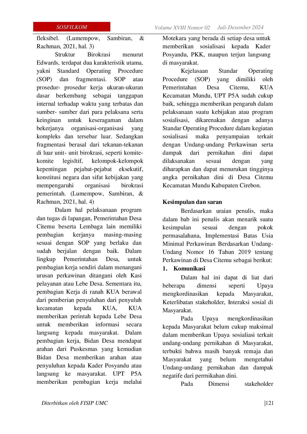 SOSFILKOM : Jurnal Sosial, Filsafat dan KomunikasiSOSFILKOM : Jurnal Sosial, Filsafat dan KomunikasiPernikahan merupakan institusi mendalam dan kaya akan nilai-nilai dan agama dalam masyarakat. Di tingkat Desa, Pernikahan menjadi pilar utama yang membangun dan memperkuat hubungan antara individu, keluarga dan komunitas secara keseluruhan. Pernikahan dini adalah pernikahan yang dilakukan oleh pasangan perempuan dan laki-laki yang berumur di bawah 19 Tahun.