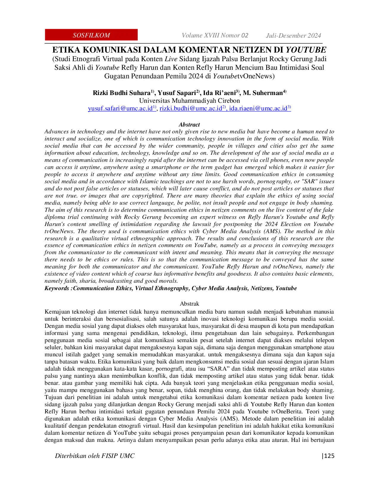 SOSFILKOM : Jurnal Sosial, Filsafat dan KomunikasiSOSFILKOM : Jurnal Sosial, Filsafat dan KomunikasiKemajuan teknologi dan internet tidak hanya memunculkan media baru namun sudah menjadi kebutuhan manusia untuk berinteraksi dan bersosialisasi, salah satunya adalah inovasi teknologi komunikasi berupa media sosial. Dengan media sosial yang dapat diakses oleh masyarakat luas, masyarakat di desa maupun di kota pun mendapatkan informasi yang sama mengenai pendidikan, teknologi, ilmu pengetahuan dan lain sebagainya. Perkembangan penggunaan media sosial sebagai alat komunikasi semakin pesat setelah internet dapat diakses melalui telepon seluler, bahkan kini masyarakat dapat mengaksesnya kapan saja, dimana saja dengan menggunakan smartphone atau muncul istilah gadget yang semakin memudahkan masyarakat untuk mengaksesnya dimana saja dan kapan saja tanpa batasan waktu. Etika komunikasi yang baik dalam mengkonsumsi media sosial dan sesuai dengan ajaran Islam adalah tidak menggunakan kata-kata kasar, pornografi, atau isu SARA dan tidak memposting artikel atau status palsu yang nantinya akan menimbulkan konflik, dan tidak memposting artikel atau status yang tidak benar atau gambar yang memiliki hak cipta.