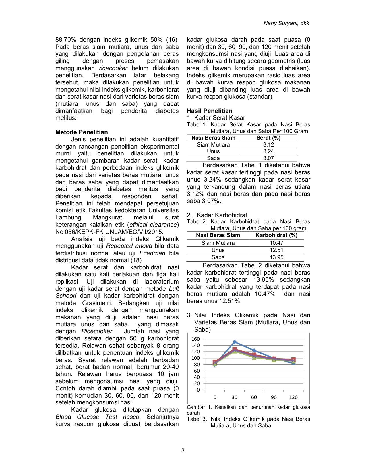 JURKESSIAJURKESSIABeras merupakan sumber utama karbohidrat dan serat pangan. Makanan yang mengandung karbohidrat rendah serta serat tinggi cenderung memiliki indeks glikemik (IG) rendah, sehingga konsumsi makanan ber‑IG rendah dapat menurunkan kadar glukosa darah pada penderita diabetes mellitus. Varietas beras Siam (Mutiara, Unus, dan Saba) banyak dibudidayakan oleh petani di Kalimantan Selatan. Penelitian ini bertujuan menentukan kadar serat, kadar karbohidrat, serta menganalisis perbedaan IG pada ketiga varietas beras tersebut untuk keperluan penderita diabetes mellitus. Metode yang digunakan berupa penelitian eksperimental; kadar serat diukur dengan metode Luft‑Schoorl, kadar karbohidrat dengan metode gravimetri, dan IG ditentukan dengan menguji kadar glukosa darah delapan responden sehat sebelum dan selama dua jam setelah mengonsumsi nasi (pengukuran tiap 30 menit). Hasil menunjukkan rata‑rata kadar serat sebesar 3,12 %, 3,24 %, dan 3,07 % untuk Mutiara, Unus, dan Saba; kadar karbohidrat masing‑masing 10,47 %, 12,51 %, dan 13,95 %; serta IG rata‑rata 54,4 % (Mutiara), 50,1 % (Unus), dan 53,4 % (Saba). Analisis repeated‑ANOVA menghasilkan p > 0,05 (0,792), yang mengindikasikan tidak terdapat perbedaan signifikan antar varietas. Kesimpulannya, ketiga varietas beras Siam memiliki IG rendah dan dapat dijadikan alternatif pangan bagi penderita diabetes mellitus.