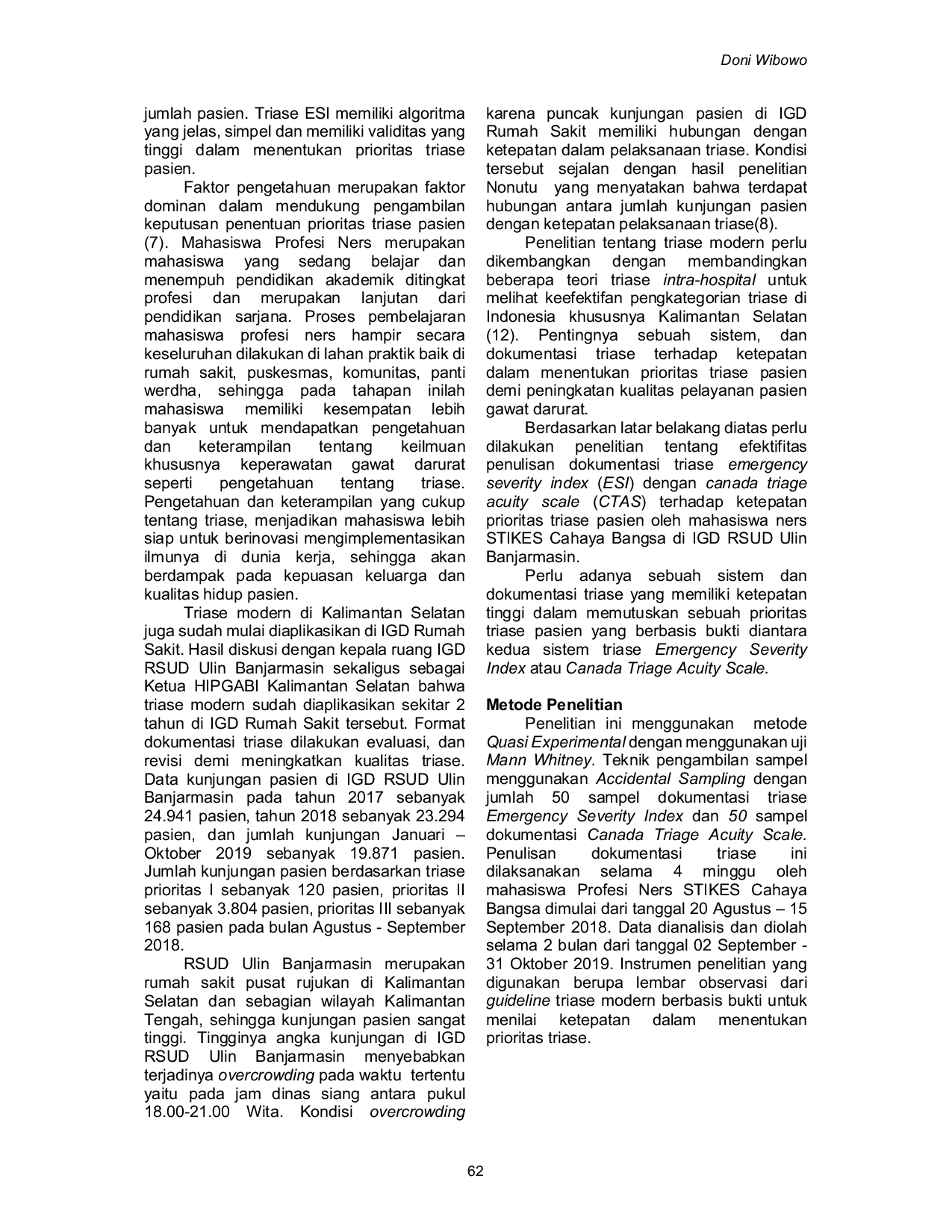 JURKESSIAJURKESSIAPendidikan keperawatan merupakan akhir dari proses pendidikan profesi keperawatan yang akan menjalankan tugas sebagai profesi perawat dalam pelayanan kesehatan. Instalasi gawat darurat (IGD) merupakan salah satu pintu masuk utama pasien inpatient, sehingga kunjungan pasien di ER cukup tinggi dan menyebabkan kepadatan. Diperlukan sistem triase dan dokumentasi berbasis bukti untuk meningkatkan keberhasilan manajemen pasien dengan kondisi gawat darurat. Tujuan penelitian ini adalah untuk meneliti efektivitas dokumentasi triase Emergency Severity Index (ESI) yang dibahas dengan Canadian Triage Acuity Scale (CTAS) terhadap ketepatan prioritas triase pasien. Penelitian ini menggunakan metode Quasi Experimental dengan uji Mann Whitney. Teknik pengambilan sampel menggunakan accidental sampling dengan total 50 sampel dokumentasi ESI dan 50 sampel dokumentasi CTAS. Hasil menunjukkan ketepatan dalam menentukan prioritas triase sebesar 46 dokumentasi ESI (92%) dan 38 dokumentasi CTAS (76%). Terdapat perbedaan signifikan dalam ketepatan prioritas triase antara ESI dan CTAS dengan nilai p 0,030. Saatnya Instalasi Gawat Darurat (IGD) menerapkan sistem triase dan dokumentasi berbasis bukti dengan mengadopsi atau mengembangkan sistem triase yang telah teruji secara ilmiah.