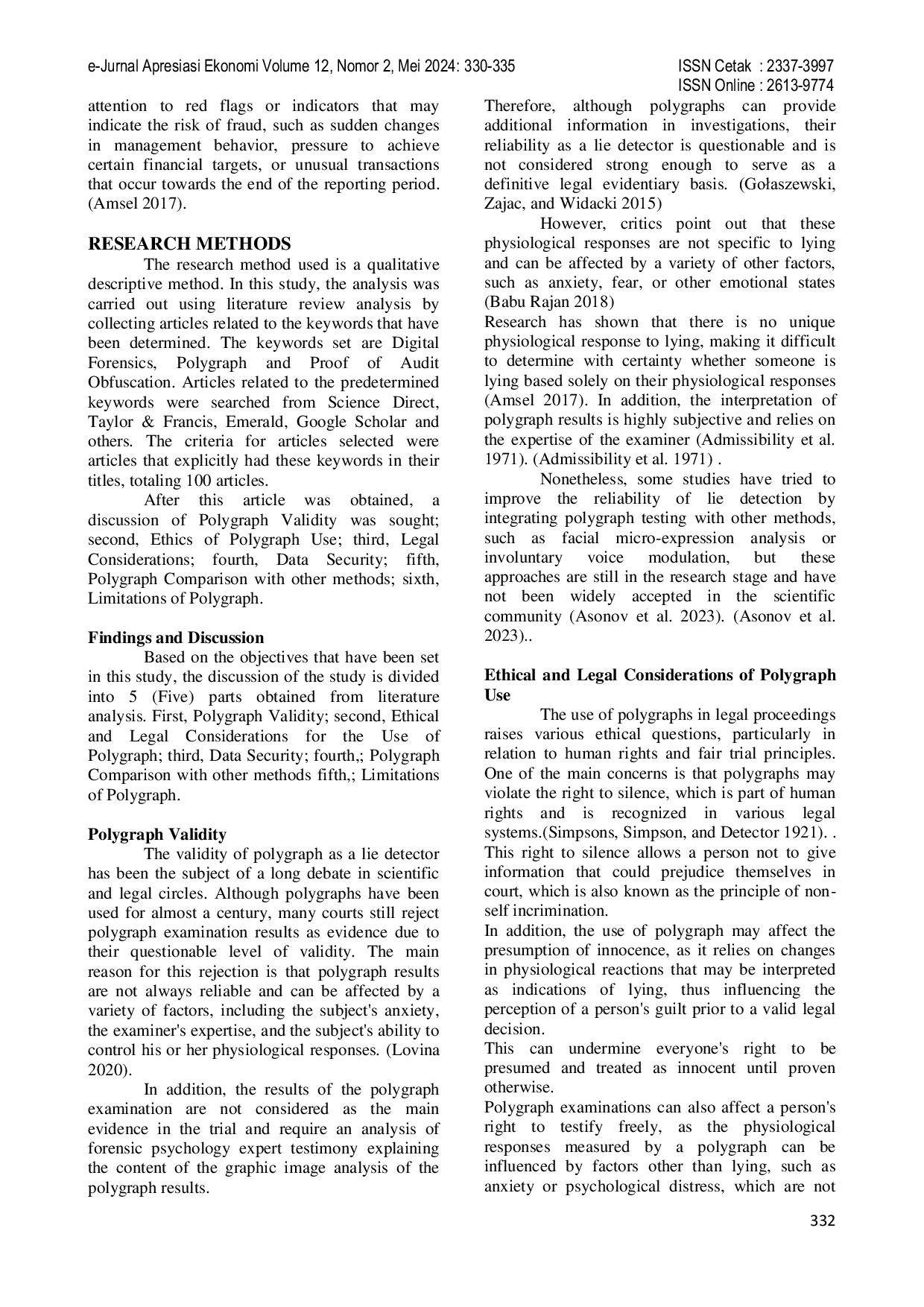 Jurnal Apresiasi EkonomiJurnal Apresiasi EkonomiArtikel ini memiliki lima tujuan utama: 1) Validitas Poligraf, 2) Penggunaan Etis Poligraf, 3) Pertimbangan Hukum, 4) Keamanan Data, dan 5) Perbandingan Poligraf dengan Metode Lain, Termasuk Keterbatasannya. Masih ada kurangnya pemahaman dan studi terkait penggunaan poligraf dalam membuktikan kebenaran dalam kasus audit, seperti kasus pembunuhan rekan sesama polisi yang diduga diatur oleh para pemimpinnya. Metode penelitian yang digunakan adalah metode deskriptif kualitatif. Penelitian ini menganalisis tinjauan literatur dengan mengumpulkan artikel yang terkait dengan kata kunci: Digital Forensics, Polygraph, dan Bukti Audit Obfuscation. Artikel dicari dari Science Direct, Taylor & Francis, Emerald, dan Google Scholar. Hasil penelitian menunjukkan bahwa validitas poligraf masih banyak dibatasi karena tidak selalu dapat diandalkan dan dapat dipengaruhi oleh faktor seperti kecemasan subjek, keahlian pemeriksa, dan kemampuan subjek untuk mengontrol respons fisiologis. Pertimbangan etis dan hukum, termasuk undang-undang di Indonesia, serta keamanan data harus memastikan kerahasiaan. Penggunaan poligraf dalam audit forensik digital memiliki potensi untuk meningkatkan validitas dan keandalan bukti digital. Meskipun memiliki potensi ini, tantangan seperti aspek etis, keamanan data, dan keterbatasan teknologi poligraf harus dipertimbangkan.