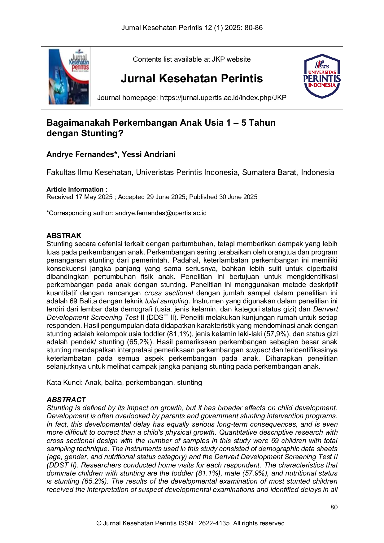 Jurnal Kesehatan Perintis (Perintis's Helath Journal)Jurnal Kesehatan Perintis (Perintis's Helath Journal)Stunting secara defenisi terkait dengan pertumbuhan, tetapi memberikan dampak yang lebih luas pada perkembangan anak. Perkembangan sering terabaikan oleh orangtua dan program penanganan stunting dari pemerintah. Padahal, keterlambatan perkembangan ini memiliki konsekuensi jangka panjang yang sama seriusnya, bahkan lebih sulit untuk diperbaiki dibandingkan pertumbuhan fisik anak. Penelitian ini bertujuan untuk mengidentifikasi perkembangan pada anak dengan stunting. Penelitian ini menggunakan metode deskriptif kuantitatif dengan rancangan cross sectional dengan jumlah sampel dalam penelitian ini adalah 69 Balita dengan teknik total sampling. Instrumen yang digunakan dalam penelitian ini terdiri dari lembar data demografi (usia, jenis kelamin, dan kategori status gizi) dan Denvert Development Screening Test II (DDST II). Peneliti melakukan kunjungan rumah untuk setiap responden. Hasil pengumpulan data didapatkan karakteristik yang mendominasi anak dengan stunting adalah kelompok usia toddler (81,1%), jenis kelamin laki-laki (57,9%), dan status gizi adalah pendek/ stunting (65,2%). Hasil pemeriksaan perkembangan sebagian besar anak stunting mendapatkan interpretasi pemeriksaan perkembangan suspect dan teridentifikasinya keterlambatan pada semua aspek perkembangan pada anak. Diharapkan penelitian selanjutknya untuk melihat dampak jangka panjang stunting pada perkembangan anak.