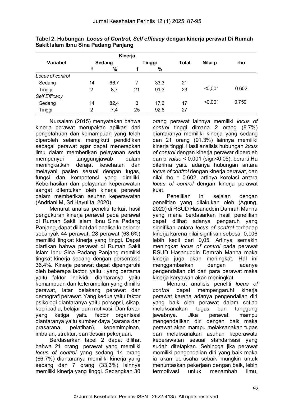 Jurnal Kesehatan Perintis (Perintis's Helath Journal)Jurnal Kesehatan Perintis (Perintis's Helath Journal)Kinerja perawat adalah pengimplementasian wewenang tugas dan tanggung jawab untuk mencapai tugas pokok profesi dan terwujudnya tujuan dan sasaran unit organisasi dalam memberikan asuhan keperawatan. Kinerja perawat dapat didorong dengan locus of control dan self efficacy yang tinggi sehingga kepercayaan perawat terhadap kemampuannya tinggi karena sifat tidak mudah menyerah dalam menyelesaikan masalah. Penelitian ini bertujuan untuk mengetahui hubungan di Rumah Sakit Islam Ibnu Sina Padang Panjang. Penelitian ini merupakan pjenis penelitian deskriptif kolerasi dengan pendekatan cross sectional terhadap 44 orang perawat yang bekerja di Rumah Sakit Islam Ibnu Sina Padang Panjang. Adanya hubungan yang signifikan antara locus of control dengan kinerja perawat di Rumah Sakit Islam Ibnu Sina Padang Panjang, diperoleh hasil P Value <0.001dan juga adanya hubungan yang signifikan antara self efficacy dengan kinerja perawat di Rumah Sakit Islam Ibnu Sina Padang Panjang, diperoleh hasil P Value <0.001 . Pada penelitian ini terdapat hubungan yang signifikan antara locs of control dan self efficacy terhadap kinerja perawata di Rumah Sakit Islam Ibnu Sina Padang Panjang.