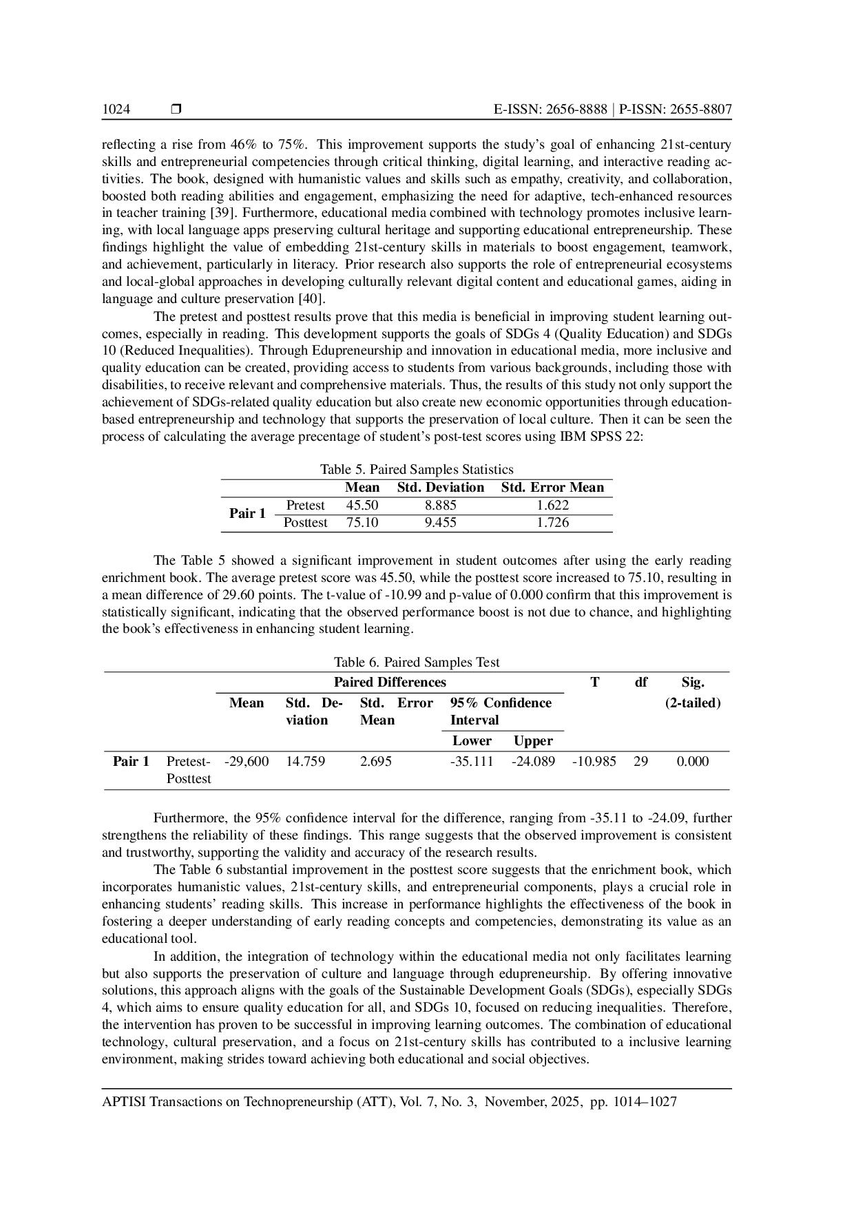 Aptisi Transactions on Technopreneurship (ATT)Aptisi Transactions on Technopreneurship (ATT)Penelitian ini bertujuan mengembangkan dan mengukur efektivitas buku pengayaan membaca awal yang mengintegrasikan nilai-nilai humanistik, keterampilan abad ke-21, dan dimensi kewirausahaan untuk siswa sekolah dasar. Berdasarkan analisis kebutuhan, buku pengayaan dirancang tidak hanya untuk meningkatkan keterampilan membaca tetapi juga mendukung pengembangan berpikir kritis, kolaborasi, empati, dan kreativitas. Hasil dari pretest dan posttest menunjukkan peningkatan yang signifikan, dengan skor pretest rata-rata 45,50 dan skor posttest 75,10, menunjukkan perbedaan 29,60 poin. Analisis menggunakan paired t-test menghasilkan nilai t-value sebesar -10,99 dengan nilai signifikansi (p-value) sebesar 0,000, menunjukkan bahwa perbedaan hasil belajar secara statistik signifikan. Penelitian ini juga didukung oleh beberapa literatur terkini yang menekankan pentingnya mengintegrasikan keterampilan abad ke-21, dimensi kewirausahaan, dan nilai-nilai humanistik dalam pembelajaran.