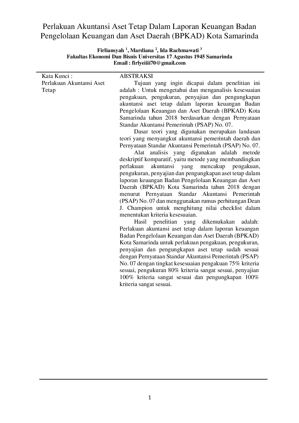 JMA: JURNAL MANAJEMEN DAN AKUNTANSIJMA: JURNAL MANAJEMEN DAN AKUNTANSITujuan yang ingin dicapai dalam penelitian ini adalah untuk mengetahui dan menganalisis kesesuaian pengakuan, pengukuran, penyajian, dan pengungkapan akuntansi aset tetap dalam laporan keuangan Badan Pengelolaan Keuangan dan Aset Daerah (BPKAD) Kota Samarinda tahun 2018 berdasarkan Pernyataan Standar Akuntansi Pemerintah (PSAP) No. 07. Dasar teori yang digunakan merupakan landasan teori yang menyangkut akuntansi pemerintah daerah dan PSAP No. 07. Alat analisis yang digunakan adalah metode deskriptif komparatif, yaitu metode yang membandingkan akuntansi yang mencakup pengakuan, perlakuan pengukuran, penyajian, dan pengungkapan aset tetap dalam laporan keuangan BPKAD Kota Samarinda tahun 2018 dengan menurut PSAP No. 07 dan menggunakan rumus perhitungan Dean J. Champion untuk menghitung nilai checklist dalam menentukan kriteria kesesuaian.