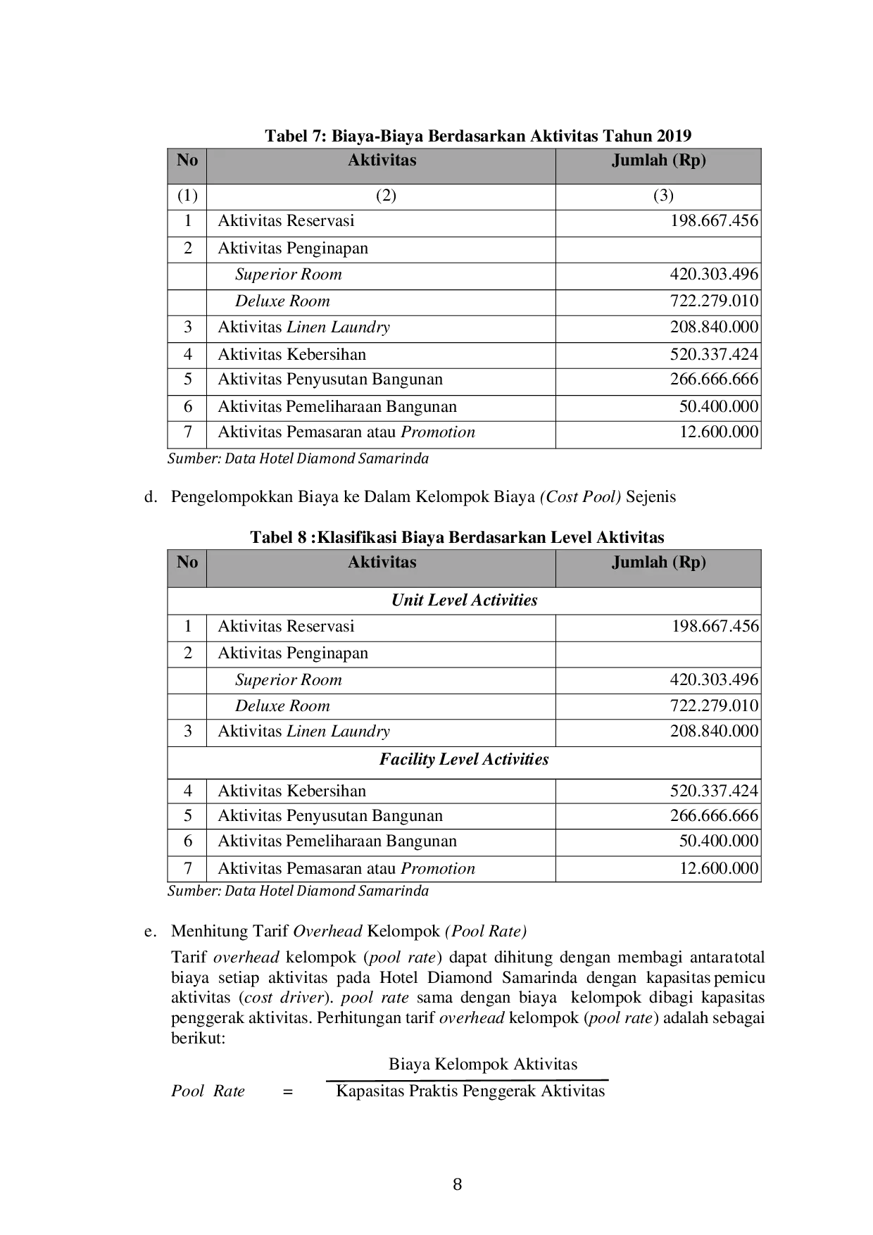 Penelitian ini menghitung harga pokok kamar Hotel Diamond Samarinda dengan metode Activity Based Costing (ABC) melalui tiga tahap, yaitu identifikasi aktivitas dan cost driver, pembebanan biaya ke aktivitas serta pengelompokan ke cost pool, dan perhitungan harga pokok per kamar.Hasil perbandingan menunjukkan bahwa biaya pokok kamar yang dihitung dengan metode ABC lebih tinggi dibandingkan dengan harga dasar yang diterapkan hotel, disebabkan oleh penggunaan banyak cost driver dan alokasi biaya yang lebih tepat pada tiap aktivitas.Selisih harga pokok kamar sebesar Rp 90.216 untuk Superior Room dan Rp 96.172 untuk Deluxe Room menandakan bahwa metode ABC menghasilkan estimasi biaya yang lebih besar daripada metode tradisional hotel.