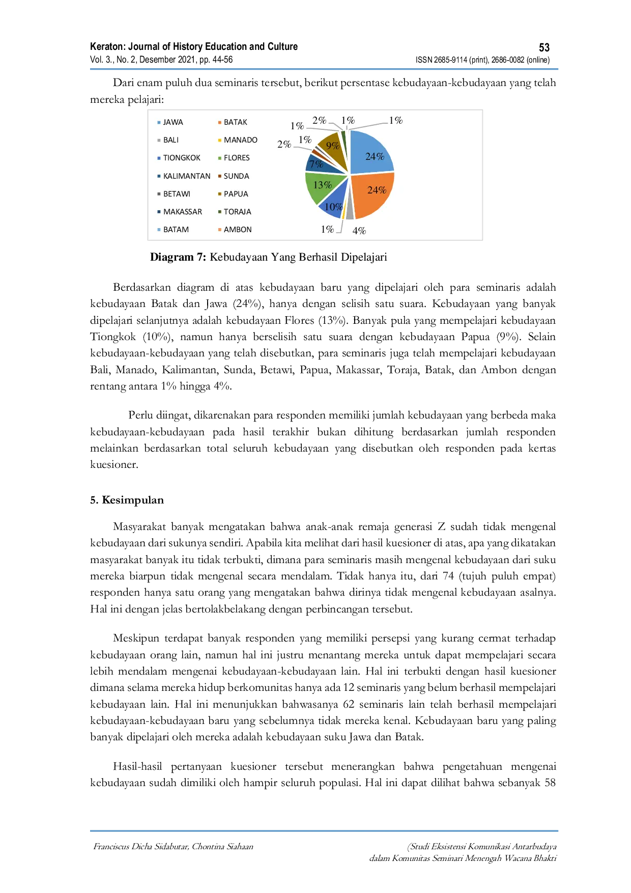 Keraton: Journal of History Education and CultureKeraton: Journal of History Education and CultureMasyarakat hidup bersama dengan orang lain berdasarkan ikatan, panggilan, dan komitmen yang sama. Penelitian ini bertujuan untuk mengetahui apakah kehidupan komunitas di Seminari Wacana Bhakti dapat membantu seminari mengenal budaya lain sehingga terjadi pertukaran budaya dalam komunitas, serta melihat apakah ada persepsi yang tidak akurat di antara seminari. Responden penelitian ini adalah seminari (anggota komunitas) di Seminari Wacana Bhakti mulai dari kelas 1 hingga Kelas Persiapan Atas (KPA). Metode penelitian yang digunakan dalam artikel ilmiah ini adalah metode kuantitatif deskriptif. Temuan dalam penelitian ini menunjukkan bahwa pertukaran budaya sudah dimiliki oleh hampir seluruh populasi dan ini didukung oleh komunikasi antarbudaya yang terjadi di dalam komunitas. Hal ini dapat dilihat dari sebanyak 58 seminari yang telah memahami dengan benar tentang komunikasi antarbudaya. Budaya yang paling banyak dipelajari dalam komunitas ini adalah budaya suku Batak dan Jawa. Tidak hanya itu, para peneliti menemukan bahwa ada beberapa orang yang bahkan tidak mengenali budaya suku mereka sendiri. Oleh karena itu, komunitas dapat memperkuat komunikasi yang terjadi antara anggota dari budaya yang berbeda, baik secara langsung maupun tidak langsung.