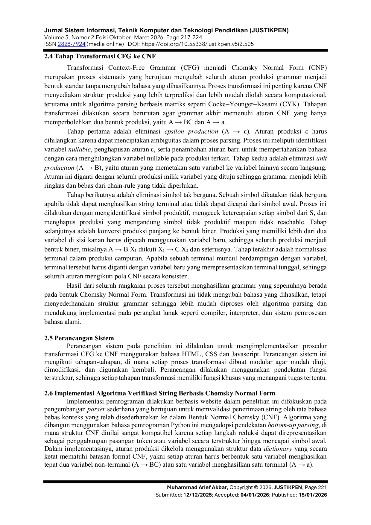 Jurnal Sistem Informasi, Teknik Informatika dan Teknologi PendidikanJurnal Sistem Informasi, Teknik Informatika dan Teknologi PendidikanTeori Bahasa dan Otomata merupakan salah satu pilar utama dalam ilmu komputer yang mempelajari bagaimana bahasa formal direpresentasikan, dibentuk, dan diproses oleh mesin komputasi. Di dalam kajian ini, Context-Free Grammar (CFG) menjadi aspek fundamental karena digunakan untuk mendefinisikan struktur sintaks bahasa pemrograman, melakukan analisis sintaks, serta menjadi dasar bagi berbagai algoritma kompilasi dan pemrosesan bahasa alami. Namun, bentuk CFG yang tidak terstruktur secara konsisten dapat menimbulkan kompleksitas pada proses parsing dan analisis komputasional. Untuk mengatasi hal tersebut, diperlukan bentuk normal yang lebih sistematis, yaitu Chomsky Normal Form (CNF). CNF menyederhanakan aturan produksi menjadi pola baku A → BC atau A → a, sehingga grammar menjadi lebih terstandarisasi dan mendukung penggunaan algoritma parsing seperti Cocke–Younger–Kasami (CYK). Hasil kajian menunjukkan bahwa transformasi CFG ke CNF tidak hanya memberikan bentuk grammar yang lebih sederhana, tetapi juga meningkatkan efisiensi dan akurasi proses parsing. Implementasi program berbasis CNF juga memberikan gambaran praktis mengenai bagaimana teori automata dapat diterapkan dalam sistem komputasi modern. Oleh karena itu, pemahaman mengenai CNF memiliki nilai strategis dalam pengembangan compiler, interpreter, perangkat lunak analisis sintaks, serta teknologi pemrosesan bahasa alami. Kajian ini diharapkan dapat memperkuat kompetensi mahasiswa dan peneliti dalam memahami serta mengimplementasikan teori bahasa formal dalam konteks komputasi.