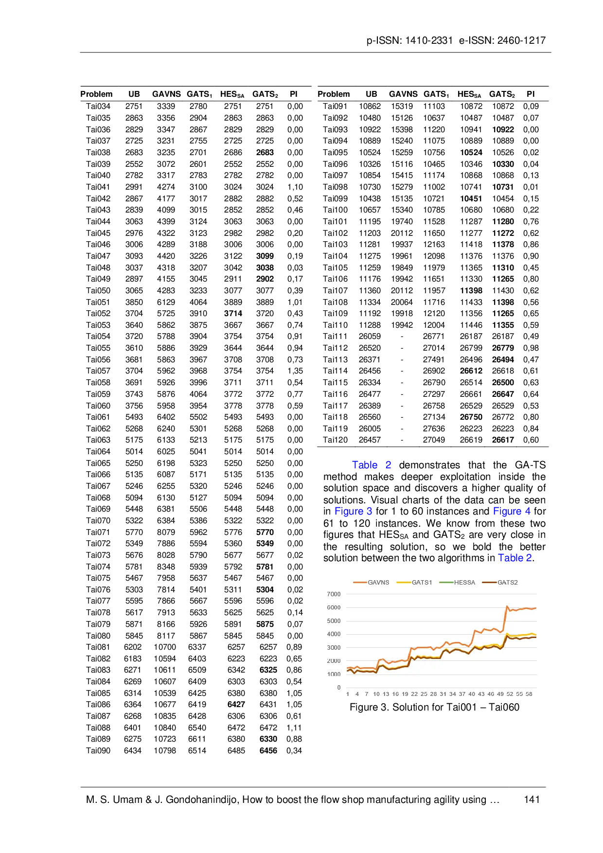 Penelitian ini memperkenalkan metode hibrida untuk mengatasi kelemahan GA.Hibridisasi ini menggabungkan algoritma pencarian tabu dengan GA untuk meningkatkan kelincahan manufaktur pada industri garmen.Hasil eksperimen menunjukkan bahwa algoritma GA-TS memiliki PRD terendah (0,28%) dan dapat meningkatkan semua instance Taillard.Selain itu, algoritma ini juga meningkatkan pekerjaan sebelumnya sebesar 2,75%.Penelitian selanjutnya akan mengeksplorasi penggunaan algoritma evolusioner lain yang dikombinasikan dengan GA karena keunggulannya.