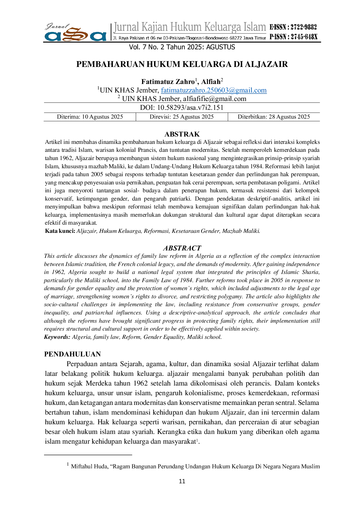 ASAASAArtikel ini membahas dinamika sebagai refleksi dari interaksi kompleks antara tradisi Islam, warisan kolonial Prancis, dan tuntutan modernitas. Setelah memperoleh kemerdekaan pada tahun 1962, Aljazair berupaya membangun sistem hukum nasional yang mengintegrasikan prinsip-prinsip syariah Islam, khususnya mazhab Maliki, ke dalam Undang-Undang Hukum Keluarga tahun 1984. Reformasi lebih lanjut terjadi pada tahun 2005 sebagai respons terhadap tuntutan kesetaraan gender dan perlindungan hak perempuan, yang mencakup penyesuaian usia pernikahan, penguatan hak cerai perempuan, serta pembatasan poligami. Artikel ini juga menyoroti tantangan sosial-budaya dalam penerapan hukum, termasuk resistensi dari kelompok konservatif, ketimpangan gender, dan pengaruh patriarki. Dengan pendekatan deskriptif-analitis, artikel ini menyimpulkan bahwa meskipun reformasi telah membawa kemajuan signifikan dalam perlindungan hak-hak keluarga, implementasinya masih memerlukan dukungan struktural dan kultural agar dapat diterapkan secara efektif di masyarakat.