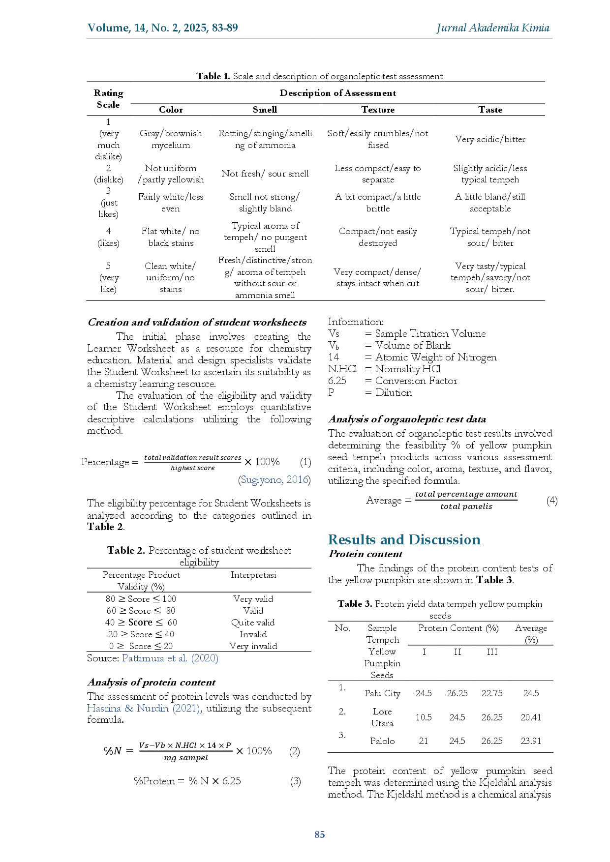 Jurnal Akademika KimiaJurnal Akademika KimiaLabu kuning (Cucurbita moschata) merupakan tanaman yang mudah beradaptasi pada berbagai kondisi tanah; namun pemanfaatan bijinya masih terbatas. Meskipun kandungan proteinnya relatif tinggi dan penting untuk pertumbuhan serta energi, biji tersebut berpotensi menjadi bahan baku alternatif untuk produksi tempe. Penelitian ini bertujuan menghasilkan tempe biji labu kuning sesuai dengan SNI 3144:2015, mengkaji variasi organoleptik serta kandungan protein tempe biji labu kuning dari tiga wilayah di Sulawesi Tengah, serta menghasilkan Lembar Kerja Siswa sebagai sumber belajar kimia yang divalidasi oleh dosen ahli. Metode kuantitatif dengan teknik analisis Kjeldahl digunakan untuk menentukan konsentrasi protein melalui tahapan destruksi, destilasi, dan titrasi. Selain itu, evaluasi sensorik dilakukan oleh 20 panelis untuk menilai tekstur, warna, rasa, dan aroma tempe biji labu kuning. Tempe yang dihasilkan menunjukkan sifat organoleptik yang baik dengan skor preferensi rata‑rata 4, berwarna putih seragam, aroma tempe khas, dan tekstur padat. Analisis kandungan protein mengungkap tempe dari Kota Palu memiliki konsentrasi tertinggi (24,5 %), diikuti Palolo (23,91 %) dan Lore Utara (20,41 %), menunjukkan pengaruh faktor lingkungan terhadap komposisi nutrisi. Sesuai SNI 3144:2015, karakteristik visual dan kandungan protein tempe biji labu kuning memenuhi kriteria kualitas yang ditetapkan. Temuan penelitian dipresentasikan dalam Lembar Kerja Siswa dengan tingkat validitas 85 %, menandakan kecocokannya sebagai sumber belajar. Penelitian ini memperluas pemanfaatan biji labu kuning sebagai sumber pangan bergizi dan mendukung pengembangan media edukasi yang inovatif.