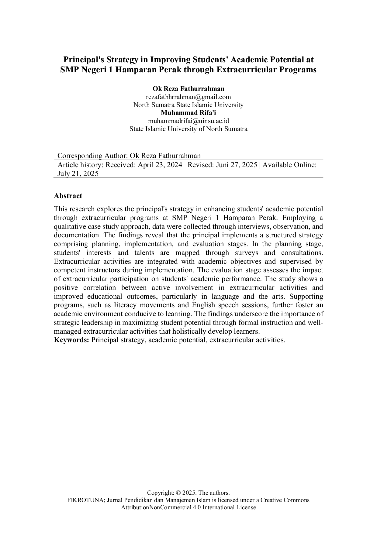 FIKROTUNA: Jurnal Pendidikan dan Manajemen IslamFIKROTUNA: Jurnal Pendidikan dan Manajemen IslamPenelitian ini mengeksplorasi strategi kepala sekolah dalam meningkatkan potensi akademik siswa melalui program ekstrakurikuler di SMP Negeri 1 Hamparan Perak. Menggunakan pendekatan studi kasus kualitatif, data dikumpulkan melalui wawancara, observasi, dan dokumentasi. Temuan menunjukkan bahwa kepala sekolah menerapkan strategi terstruktur yang mencakup tahapan perencanaan, pelaksanaan, dan evaluasi. Dalam tahap perencanaan, minat dan bakat siswa dipetakan melalui survei dan konsultasi. Kegiatan ekstrakurikuler diintegrasikan dengan tujuan akademik dan diawasi oleh instruktur kompeten selama pelaksanaan. Tahap evaluasi mengukur dampak partisipasi ekstrakurikuler terhadap prestasi akademik siswa. Studi menunjukkan korelasi positif antara keterlibatan aktif dalam kegiatan ekstrakurikuler dan hasil pendidikan, khususnya dalam bidang bahasa dan seni. Program pendukung seperti gerakan literasi dan sesi pidato bahasa Inggris lebih lanjut menciptakan lingkungan akademik yang kondusif untuk belajar. Temuan ini menekankan pentingnya kepemimpinan strategis dalam memaksimalkan potensi siswa melalui instruksi formal dan kegiatan ekstrakurikuler yang dikelola dengan baik.