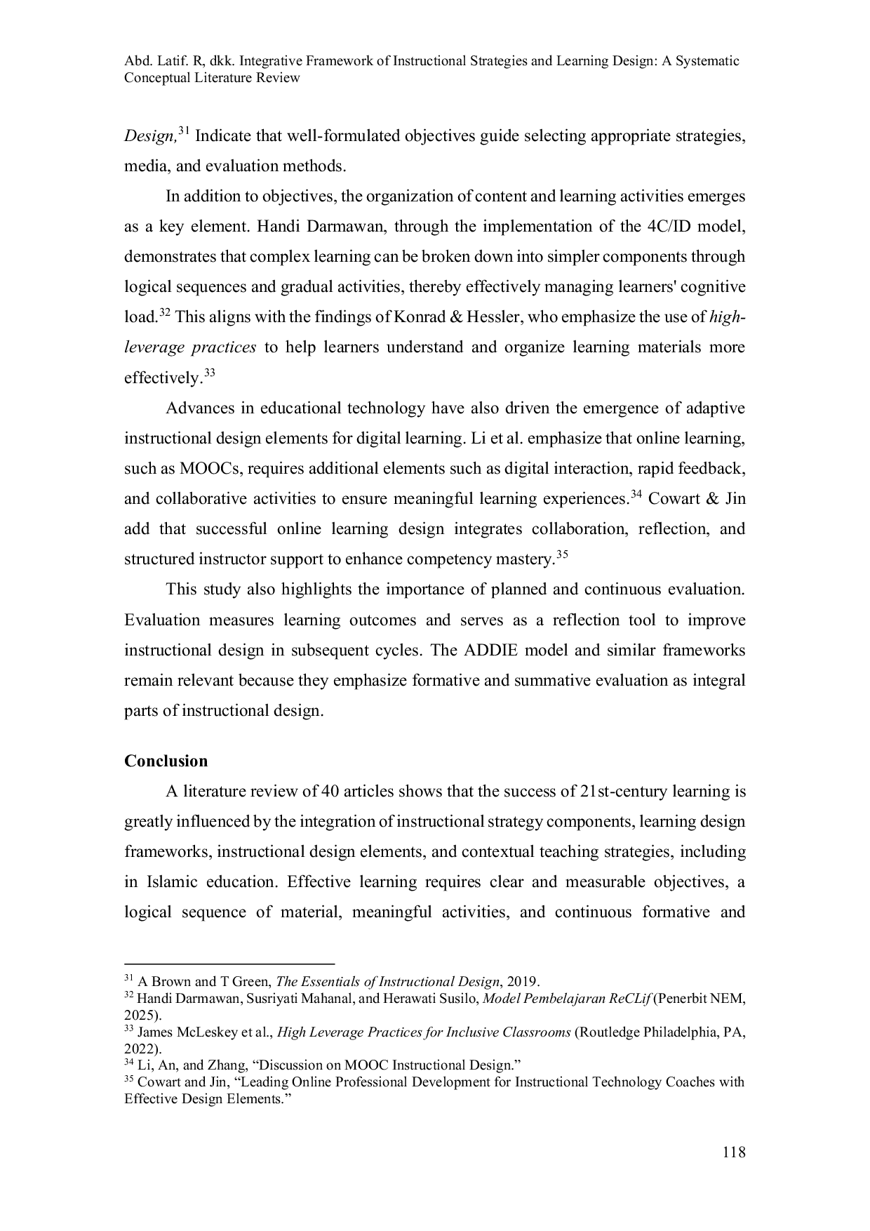Kajian ini menyimpulkan bahwa keberhasilan pembelajaran abad ke-21 sangat dipengaruhi oleh integrasi komponen strategi instruksional, kerangka desain pembelajaran, elemen desain instruksional, dan strategi pengajaran kontekstual.Pembelajaran efektif memerlukan tujuan yang jelas, urutan materi logis, aktivitas bermakna, dan evaluasi berkelanjutan.Kerangka desain pembelajaran yang fleksibel dan berpusat pada peserta didik mendukung implementasi e-learning, mobile learning, dan MOOC.Dalam pendidikan Islam, integrasi metode tradisional dengan teknologi kolaboratif meningkatkan keterlibatan siswa dan internalisasi nilai-nilai.