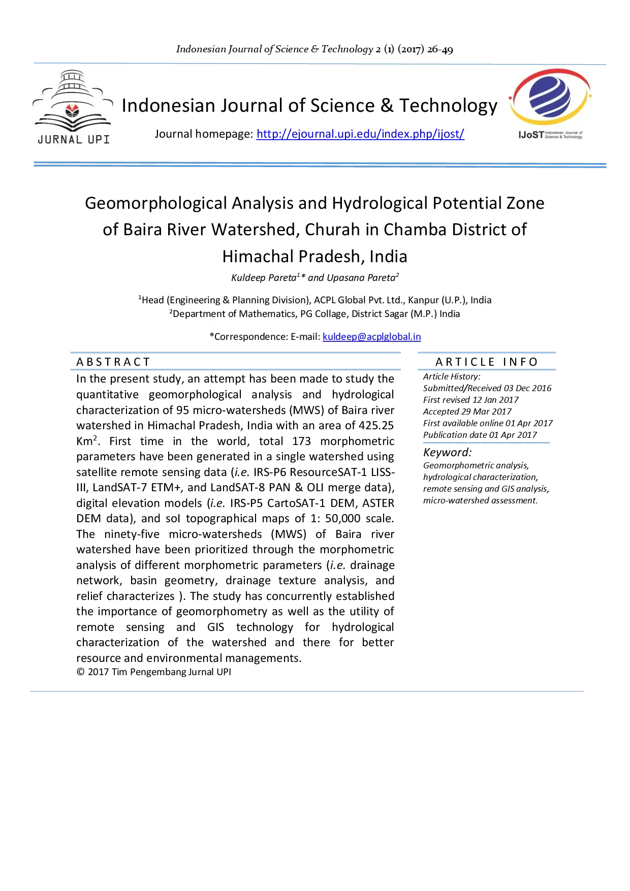 Indonesian Journal of Science and TechnologyIndonesian Journal of Science and TechnologyDalam penelitian ini, dilakukan upaya untuk mempelajari analisis geomorfologis kuantitatif dan karakterisasi hidrologis dari 95 mikro-daerah aliran sungai (MWS) di daerah aliran sungai Baira, Himachal Pradesh, India, dengan luas 425,25 km². Untuk pertama kalinya di dunia, total 173 parameter morfometrik telah dihasilkan dalam satu daerah aliran sungai menggunakan data penginderaan jauh satelit (yakni IRS-P6 ResourceSAT-1 LISS-III, LandSAT-7 ETM , dan gabungan data LandSAT-8 PAN & OLI), model elevasi digital (yakni IRS-P5 CartoSAT-1 DEM, data ASTER DEM), serta peta topografi skala 1:50.000. Kesembilanpuluh lima mikro-daerah aliran sungai (MWS) di daerah aliran sungai Baira telah diprioritaskan melalui analisis morfometrik berbagai parameter morfometrik (yakni jaringan drainase, geometri dasar, analisis tekstur drainase, dan karakteristik relief). Penelitian ini secara bersamaan menegaskan pentingnya geomorfometri serta manfaat penginderaan jauh dan SIG untuk karakterisasi hidrologis daerah aliran sungai dan dengan demikian mendukung pengelolaan sumber daya dan lingkungan yang lebih baik.