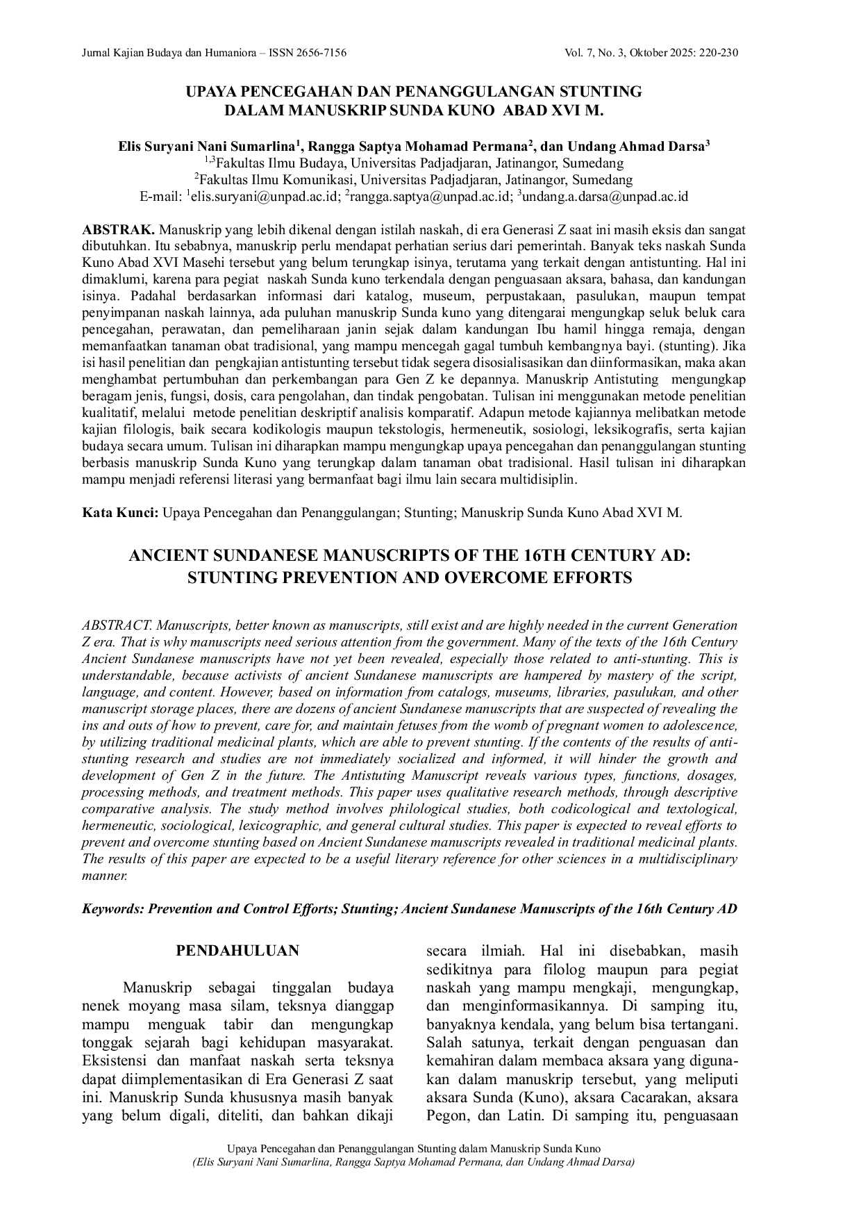 Jurnal Kajian Budaya dan HumanioraJurnal Kajian Budaya dan HumanioraManuskrip yang lebih dikenal dengan istilah naskah, di era Generasi Z saat ini masih eksis dan sangat dibutuhkan. Itu sebabnya, manuskrip perlu mendapat perhatian serius dari pemerintah. Banyak teks naskah Sunda Kuno Abad XVI Masehi tersebut yang belum terungkap isinya, terutama yang terkait dengan antistunting. Hal ini dimaklumi, karena para pegiat naskah Sunda kuno terkendala dengan penguasaan aksara, bahasa, dan kandungan isinya. Padahal berdasarkan informasi dari katalog, museum, perpustakaan, pasulukan, maupun tempat penyimpanan naskah lainnya, ada puluhan manuskrip Sunda kuno yang ditengarai mengungkap seluk beluk cara pencegahan, perawatan, dan pemeliharaan janin sejak dalam kandungan Ibu hamil hingga remaja, dengan memanfaatkan tanaman obat tradisional, yang mampu mencegah gagal tumbuh kembangnya bayi. (stunting). Jika isi hasil penelitian dan pengkajian antistunting tersebut tidak segera disosialisasikan dan diinformasikan, maka akan menghambat pertumbuhan dan perkembangan para Gen Z ke depannya. Manuskrip Antistuting mengungkap beragam jenis, fungsi, dosis, cara pengolahan, dan tindak pengobatan. Tulisan ini menggunakan metode penelitian kualitatif, melalui metode penelitian deskriptif analisis komparatif. Adapun metode kajiannya melibatkan metode kajian filologis, baik secara kodikologis maupun tekstologis, hermeneutik, sosiologi, leksikografis, serta kajian budaya secara umum. Tulisan ini diharapkan mampu mengungkap upaya pencegahan dan penanggulangan stunting berbasis manuskrip Sunda Kuno yang terungkap dalam tanaman obat tradisional. Hasil tulisan ini diharapkan mampu menjadi referensi literasi yang bermanfaat bagi ilmu lain secara multidisiplin.