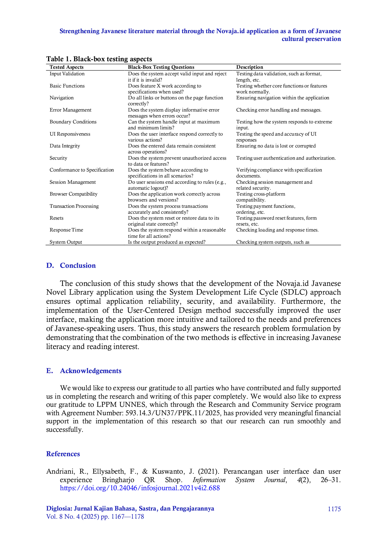 Kesimpulan studi ini menunjukkan bahwa pengembangan aplikasi Perpustakaan Novel Jawa Novaja.id menggunakan pendekatan Siklus Hidup Pengembangan Sistem (SDLC) memastikan keandalan, keamanan, dan ketersediaan aplikasi secara optimal.Selain itu, penerapan metode Desain Berpusat pada Pengguna berhasil meningkatkan antarmuka pengguna, membuat aplikasi lebih intuitif dan disesuaikan dengan kebutuhan serta preferensi pengguna berbahasa Jawa.Dengan demikian, studi ini menjawab formulasi masalah penelitian dengan menunjukkan bahwa kombinasi dua metode tersebut efektif dalam meningkatkan literasi bahasa Jawa dan minat membaca.