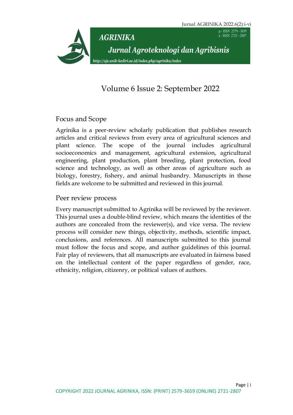 Agrinika senang meluncurkan Volume 6 Edisi 2 (September 2022).Edisi ini terdiri dari 11 artikel dalam lingkup jurnal.Penghargaan untuk seluruh Tim Editorial Agrinika bersama dengan para reviewer yang telah meluangkan waktu untuk meningkatkan kualitas artikel ilmiah untuk edisi ini.Semoga Agrinika dapat berkontribusi lebih banyak dalam penyebaran ilmu pengetahuan dan teknologi di edisi berikutnya.