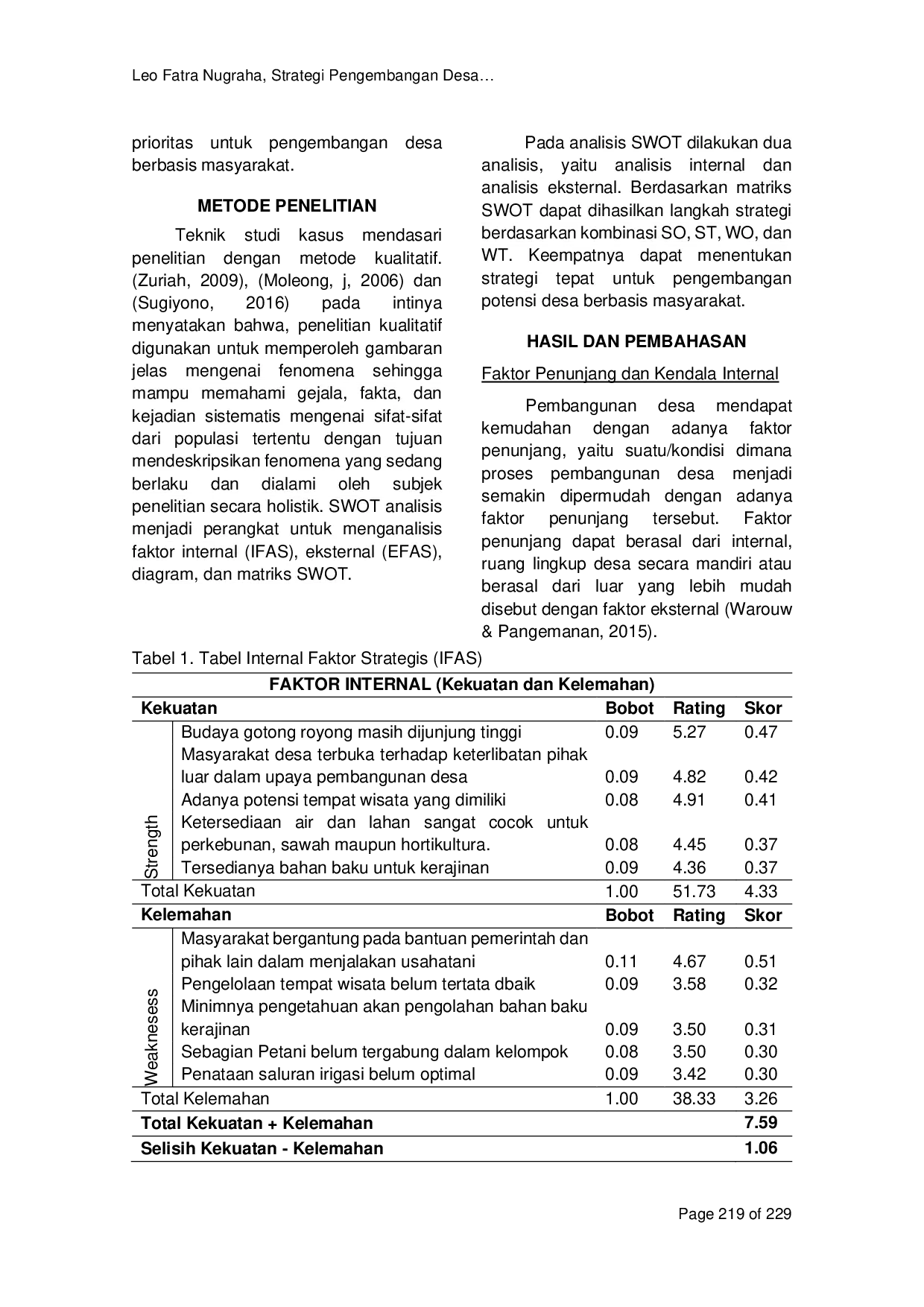 Modal pembangunan desa di Kecamatan Cigalontang belum dimanfaatkan secara optimal, dengan infrastruktur yang buruk dan sistem irigasi tidak memadai, menyebabkan biaya produksi meningkat dan harga hasil menurun.Pengembangan desa berbasis masyarakat dipengaruhi oleh lima faktor strategis.budaya gotong royong, ketergantungan pada bantuan pemerintah, investasi swasta, ketersediaan teknologi, serta konflik akibat intervensi eksternal.Strategi prioritas yang direkomendasikan adalah memaksimalkan program pemerintah dalam pembangunan infrastruktur dengan melibatkan masyarakat secara aktif.