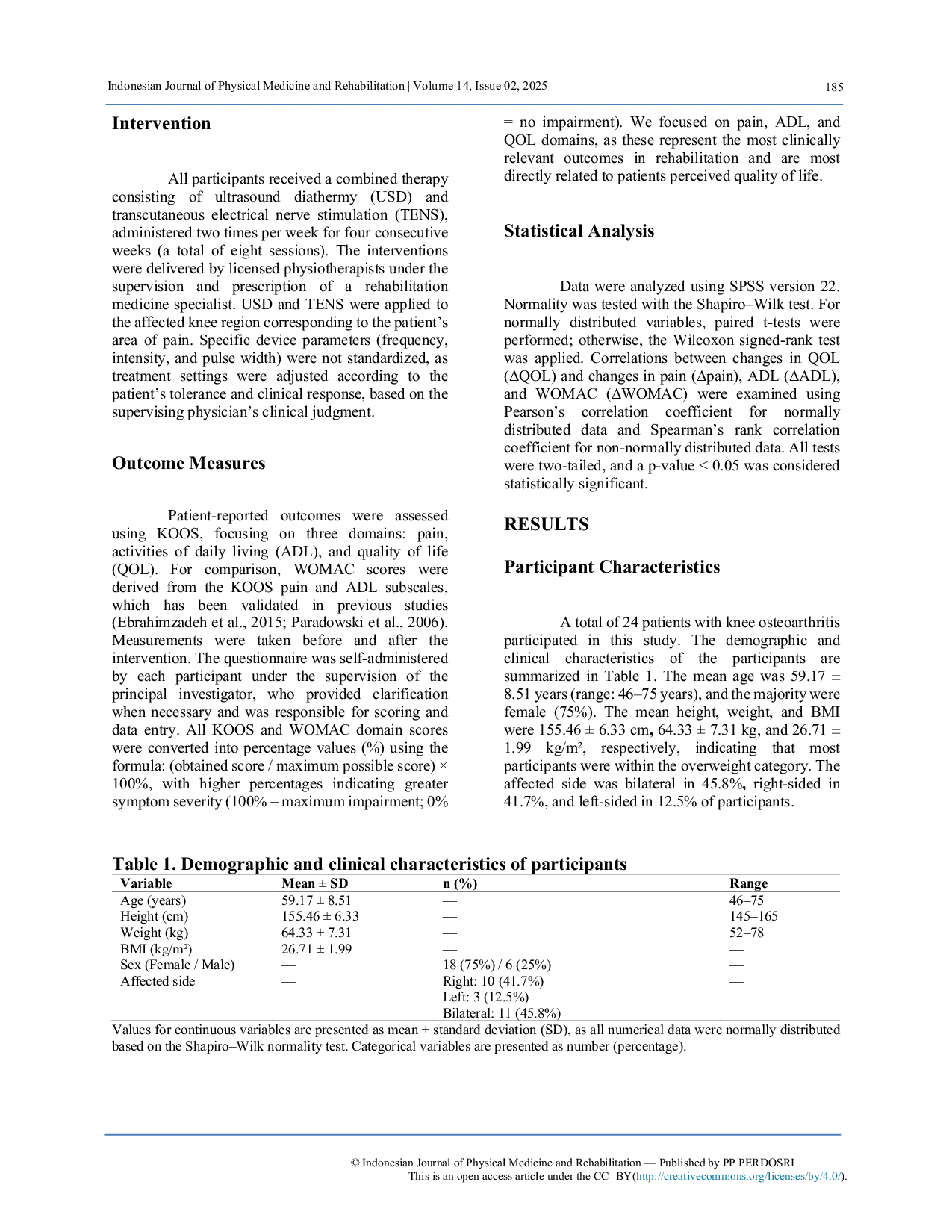Indonesian Journal of Physical Medicine and RehabilitationIndonesian Journal of Physical Medicine and RehabilitationKnee osteoarthritis (KOA) adalah penyakit sendi degeneratif yang menyebabkan nyeri dan keterbatasan fungsi, dengan prevalensi yang meningkat secara global dan di Indonesia. Hasilnya umumnya dinilai menggunakan Western Ontario and McMaster Universities Osteoarthritis Index (WOMAC), yang mengevaluasi nyeri, kekakuan, dan fungsi, tetapi tidak mencakup kualitas hidup (QOL). Kedokteran rehabilitasi menekankan tidak hanya pereda gejala tetapi juga pemulihan dan kualitas hidup. Knee Injury and Osteoarthritis Outcome Score (KOOS) menambahkan domain QOL untuk evaluasi yang lebih komprehensif.