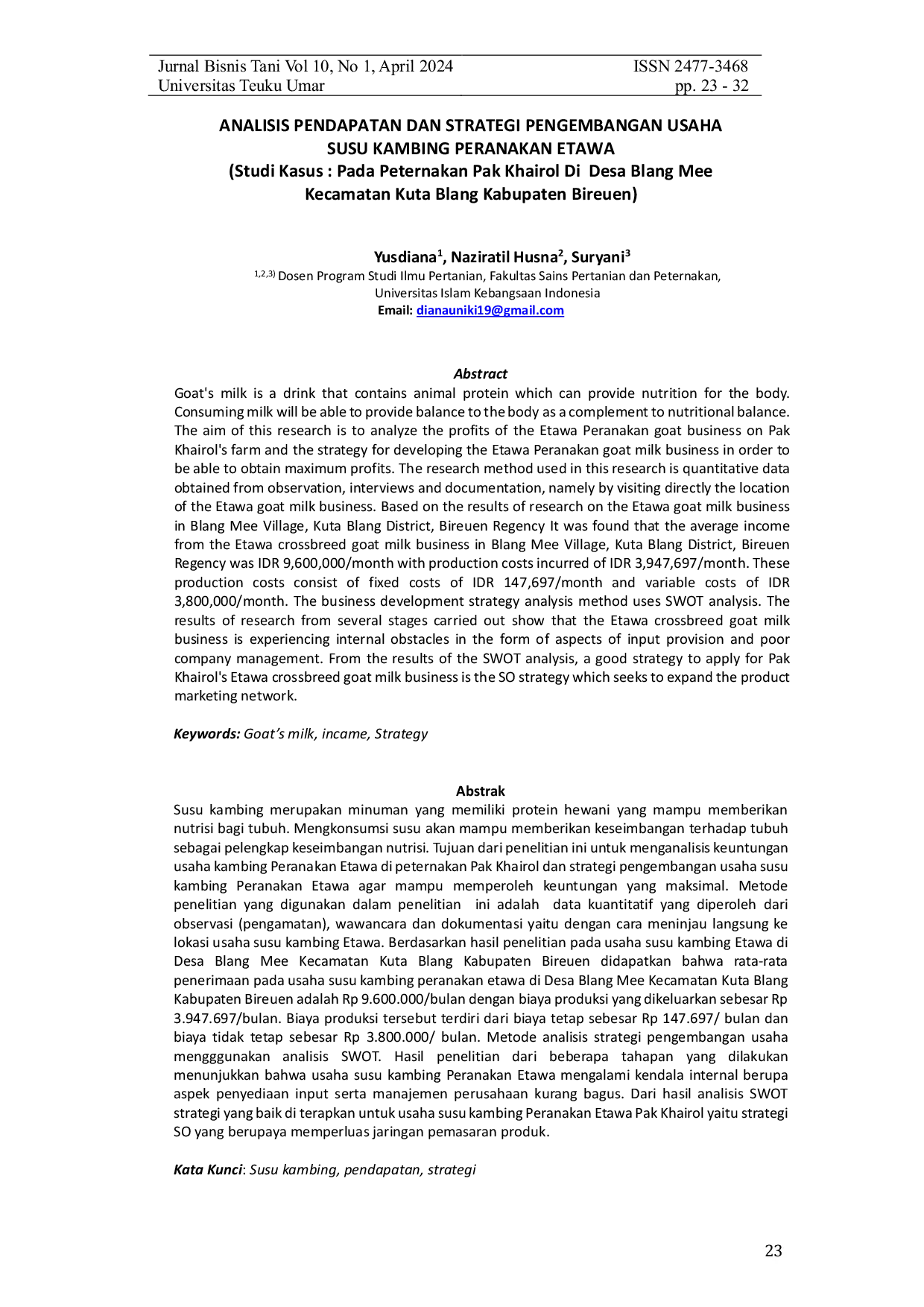 Jurnal Bisnis TaniJurnal Bisnis TaniSusu kambing merupakan minuman yang memiliki protein hewani yang mampu memberikan nutrisi bagi tubuh. Mengkonsumsi susu akan mampu memberikan keseimbangan terhadap tubuh sebagai pelengkap keseimbangan nutrisi. Tujuan dari penelitian ini untuk menganalisis keuntungan usaha kambing Peranakan Etawa di peternakan Pak Khairol dan strategi pengembangan usaha susu kambing Peranakan Etawa agar mampu memperoleh keuntungan yang maksimal. Metode penelitian yang digunakan dalam penelitian ini adalah data kuantitatif yang diperoleh dari observasi (pengamatan), wawancara dan dokumentasi yaitu dengan cara meninjau langsung ke lokasi usaha susu kambing Etawa. Berdasarkan hasil penelitian pada usaha susu kambing Etawa di Desa Blang Mee Kecamatan Kuta Blang Kabupaten Bireuen didapatkan bahwa rata-rata penerimaan pada usaha susu kambing peranakan etawa di Desa Blang Mee Kecamatan Kuta Blang Kabupaten Bireuen adalah Rp 9.600.000/bulan dengan biaya produksi yang dikeluarkan sebesar Rp 3.947.697/bulan. Biaya produksi tersebut terdiri dari biaya tetap sebesar Rp 147.697/ bulan dan biaya tidak tetap sebesar Rp 3.800.000/ bulan. Metode analisis strategi pengembangan usaha mengggunakan analisis SWOT. Hasil penelitian dari beberapa tahapan yang dilakukan menunjukkan bahwa usaha susu kambing Peranakan Etawa mengalami kendala internal berupa aspek penyediaan input serta manajemen perusahaan kurang bagus. Dari hasil analisis SWOT strategi yang baik di terapkan untuk usaha susu kambing Peranakan Etawa Pak Khairol yaitu strategi SO yang berupaya memperluas jaringan pemasaran produk.