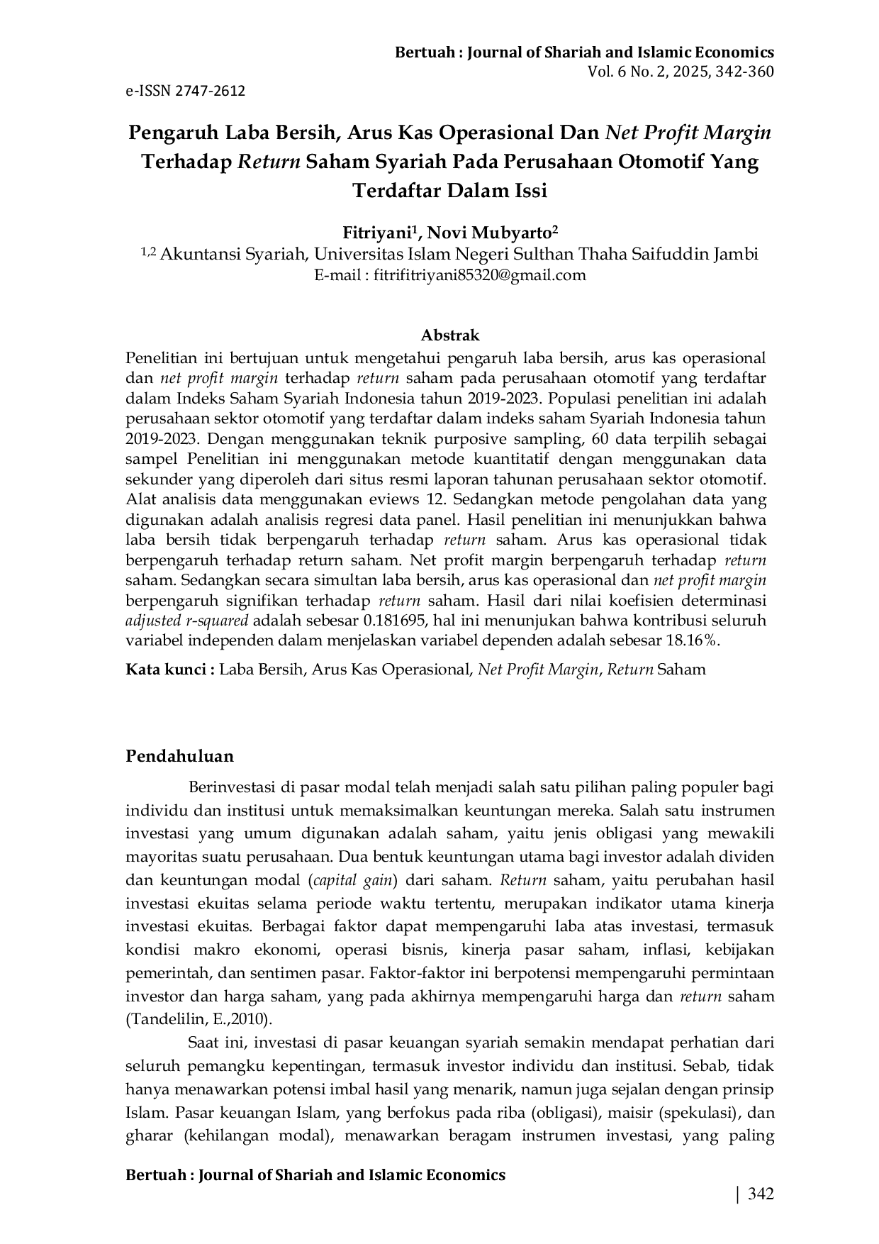 Penelitian selanjutnya dapat menguji bagaimana kualitas tata kelola perusahaan memoderasi pengaruh net profit margin terhadap return saham pada perusahaan otomotif yang terdaftar di ISSI, dengan merumuskan pertanyaan: apakah perusahaan dengan tingkat governance yang tinggi menunjukkan hubungan yang lebih kuat antara margin keuntungan bersih dan return? Selanjutnya, studi dapat menyelidiki peran faktor lingkungan, sosial, dan tata kelola (ESG) dalam memperkuat atau melemahkan efek arus kas operasional dan profitabilitas terhadap return saham, melalui pertanyaan: bagaimana skor ESG mempengaruhi hubungan antara variabel keuangan tradisional dan kinerja saham syariah? Akhirnya, penelitian komparatif longitudinal antara perusahaan otomotif konvensional dan syariah selama periode yang lebih luas (misalnya 2015‑2025) dapat menjawab: apakah terdapat perbedaan signifikan dalam determinan return saham antara kedua kelompok, dan bagaimana dinamika tersebut berubah seiring waktu, dengan menggunakan metode panel data dan teknik estimasi yang sesuai.