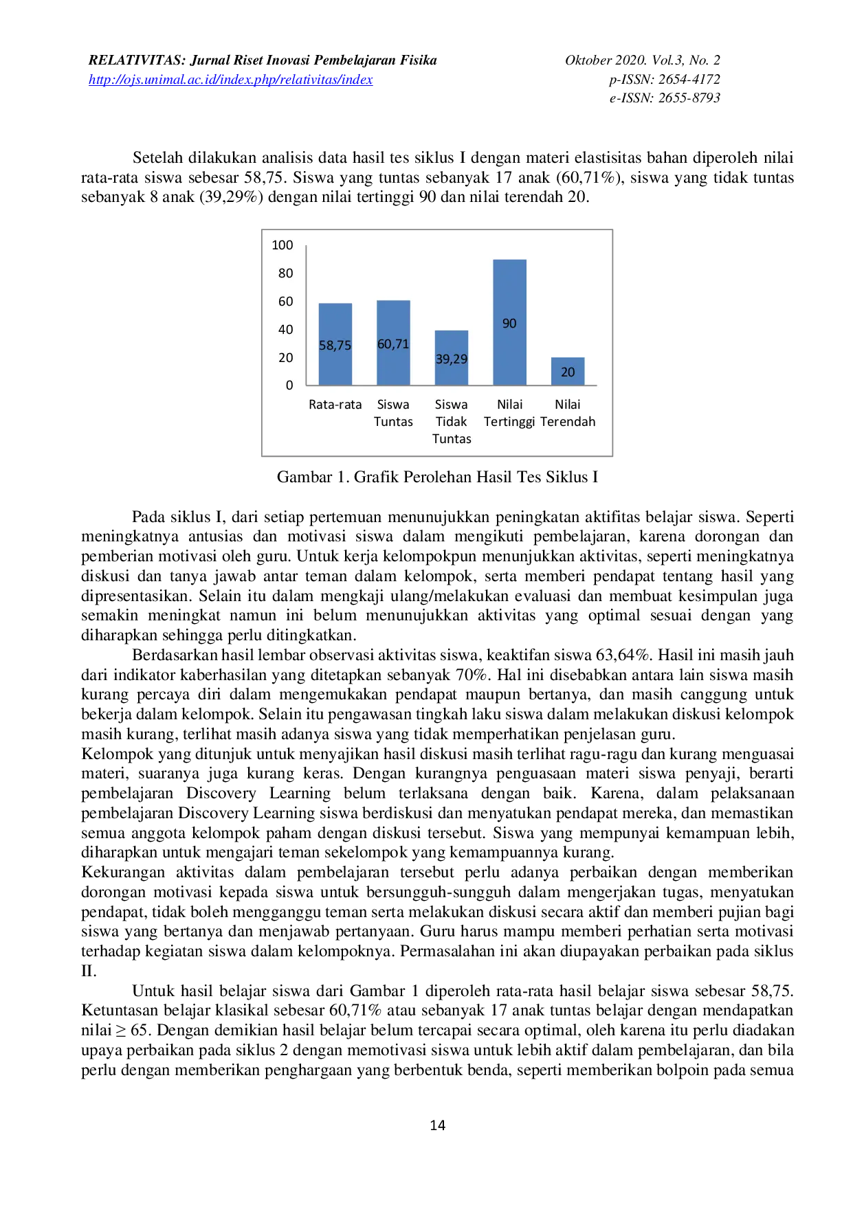 Relativitas: Jurnal Riset Inovasi Pembelajaran FisikaRelativitas: Jurnal Riset Inovasi Pembelajaran FisikaPenelitian ini bertujuan untuk mengkaji sejauh mana model pembelajaran Discovery Learning dapat meningkatkan hasil belajar siswa. Subjek penelitian ini adalah siswa kelas XI IPA-5 semester 1 yang berjumlah 24 siswa, terdiri dari 10 siswa putra dan 14 siswa putri. Jenis penelitian yang digunakan adalah penelitian tindakan kelas (PTK) yang berlangsung dalam 2 siklus, masing-masing siklus terdiri atas tahap perencanaan, tindakan, observasi, dan refleksi. Data yang diperoleh dalam penelitian ini meliputi: hasil belajar siswa yang diambil dari pemberian soal tes pada akhir siklus, kemampuan guru dalam pembelajaran yang diambil dari lembar observasi, aktivitas siswa dalam pembelajaran yang diambil dari lembar observasi, dan data tentang refleksi siswa terhadap pembelajaran yang diambil dari angket pada setiap akhir pertemuan. Indikator keberhasilan pada penelitian ini adalah: (1) apabila ≥ 70% dari jumlah siswa berkategori tuntas dengan criteria tuntas belajaran apabila nilai hasil evaluasi pada siklus I, II, ≥ 65, (2) apabila aktivitas siswa dalam pembelajaran ≥ 70% sebagai diukur dengan melihat lembar observasi siswa.