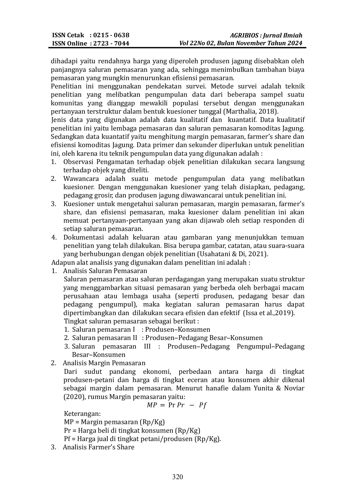 AGRIBIOSAGRIBIOSPertanian padi dan pertanian tanaman palawija adalah dua kategori utama budidaya tanaman pangan. Tujuan pengembangan tanaman palawija juga untuk mengentaskan kemiskinan dan meningkatkan ketahanan pangan. Setelah padi, tanaman palawija merupakan kelompok tanaman pangan yang paling banyak jumlahnya. Dengan menggunakan berbagai jenis irigasi di sawah, para petani menanam jagung, kedelai, dan kacang tanah sebagai tanaman palawija utama selama musim kemarau. Tujuan penelitian ini adalah untuk mengetahui sistem saluran pemasaran, margin pemasaran, farmers share dan efisiensi pemasaran jagung di Kabupaten Purbolinggo. Zea mays linn adalah nama latin dari tanaman jagung, yaitu tanaman rumput‑rumputan (graminae) yang berbiji tunggal (monokotil). Penelitian ini menggunakan pendekatan survei. kuesioner, dokumentasi, wawancara, dan observasi merupakan metode yang digunakan untuk mengumpulkan data dalam penelitian ini. Rumus Slovin dan metode Snowball Sampling digunakan dalam prosedur pengambilan sampel. Analisis saluran pemasaran, margin pemasaran, farmers share, dan efisiensi pemasaran merupakan teknik analisis data. Hasil penelitian ini terdapat tiga saluran pemasaran. Saluran pemasaran I : Petani – Konsumen. Saluran pemasaran II : Petani – Pedagang Besar – Konsumen. Saluran pemasaran III : Petani – Pedagang Pengumpul – Pedagang Besar – Konsumen. Margin pemasaran jagung pipilan pada saluran I, II dan III secara berturut – turut sebesar Rp0/kg, Rp1.300/kg dan Rp2.200/kg. Perbedaan margin pemasaran antara saluran pemasaran I, II dan III disebabkan oleh perbedaan biaya pemasaran yang dikeluarkan pada setiap lembaga pemasaran.Persentase farmers share secara berturut – turut adalah saluran pemasaran I dengan persentase 100%, saluran pemasaran II dengan persentase 74% dan saluran pemasaran III dengan persentase 56%. Nilai efisiensi pemasaran pada saluran pemasaran I, II dan III secara berturut – turut adalah saluran pemasaran I dengan persentase 11,66%, saluran pemasaran II dengan persentase 12,06% dan saluran pemasaran III dengan persentase 15,06%.