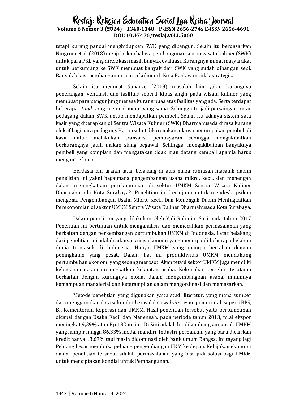 Reslaj : Religion Education Social Laa Roiba JournalReslaj : Religion Education Social Laa Roiba JournalRumusan masalah dalam penelitian ini yakni bagaimana pengembangan usaha mikro, kecil, dan menengah dalam meningkatkan perekonomian di sektor UMKM Sentra Wisata Kuliner Dharmahusada Kota Surabaya. Penelitian ini bertujuan untuk mendeskripsikan mengenai Pengembangan Usaha Mikro, Kecil, Dan Menengah Dalam Meningkatkan Perekonomian di sektor UMKM Sentra Wisata Kuliner Dharmahusada Kota Surabaya. Penelitian ini menggunakan metode kualitatif dengan pendekatan deskriptif untuk mengkaji strategi pengembangan dunia usaha dalam meningkatkan perekonomian sektor UMKM di Sentra Wisata Kuliner Dharmahusada Kota Surabaya. Hasil penelitian menunjukkan bahwa pemerintah Kota Surabaya telah melakukan pembuatan kebijakan penataan dan penyediaan ruang PKL di Sentra Wisata Kuliner Dharmahusada dengan pemikiran yang rasional, proporsional, dan terpola. Namun, masih terdapat kendala dalam implementasi kebijakan ini, seperti kurangnya sosialisasi, keterbatasan akses informasi, dan kurangnya dukungan atau bimbingan. Untuk mengatasi masalah ini, diperlukan sosialisasi yang efektif mengenai keringanan pajak bagi UMKM, pembuatan informasi terpadu, pendirian pusat konsultasi dan pengembangan UMKM, serta pembuatan sistem pemasaran bersama.