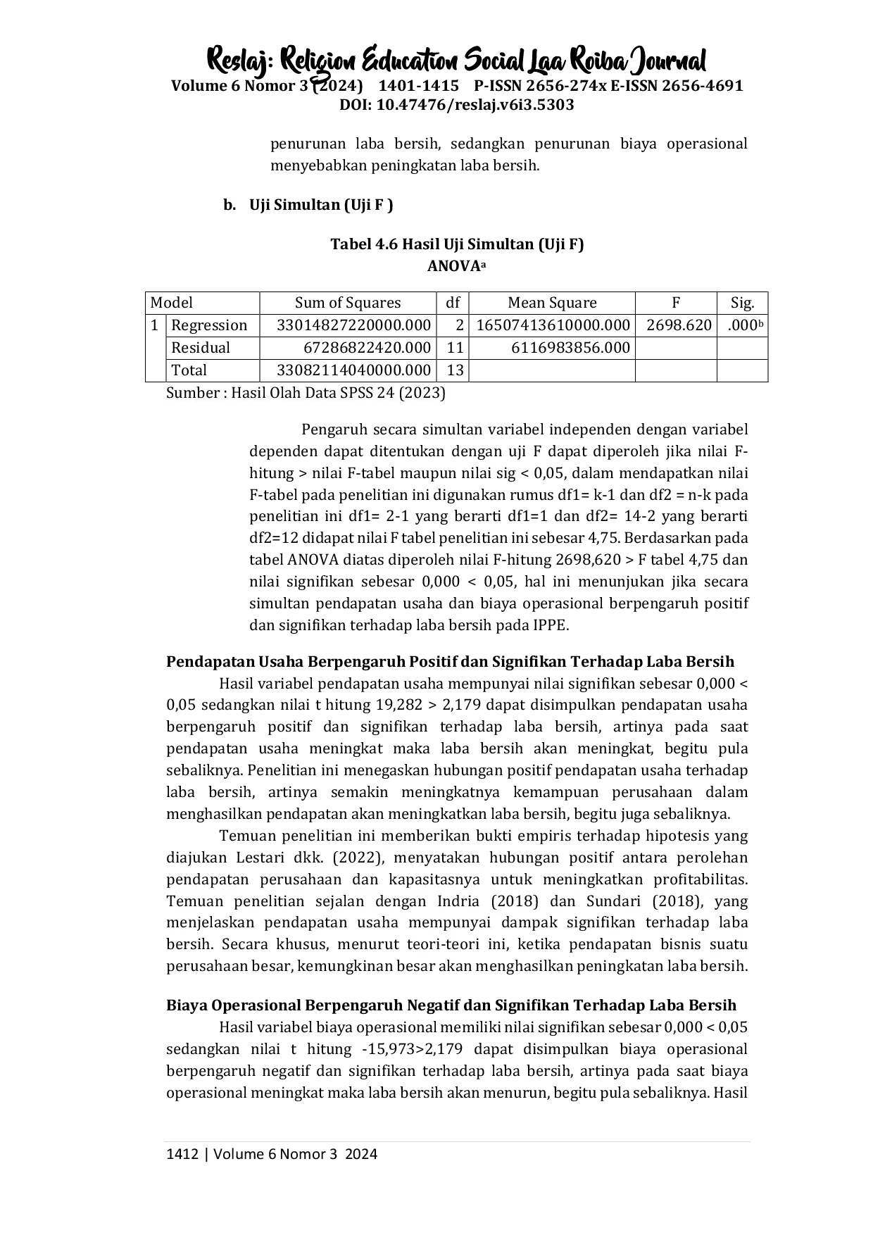 Reslaj : Religion Education Social Laa Roiba JournalReslaj : Religion Education Social Laa Roiba JournalPenelitian ini mempunyai tujuan dalam membantu perusahaan mengetahui tingkat pencapaian kinerjanya dalam mencapai laba bersih, kondisi keuangannya serta pengaruhnya secara parsial maupun simultan pendapatan usaha maupun biaya operasional terhadap laba bersih periode triwulan I tahun 2019-triwulan I tahun 2023 pada PT Indo Pureco Pratama, Tbk. Penelitian ini memakai metode analisis kuantitatif dengan teknik analisis regresi linier berganda memakai SPSS Versi 24. Populasinya PT Indo Pureco Pratama, Tbk dengan sampel laporan keuangan periode triwulan I tahun 2019-triwulan IV tahun 2023 dengan teknik pengambilan sampel menggunakan purposive sampling. Hasil penelitian deskriptif menjelaskan pendapatan usaha, biaya operasional dan laba bersih PT Indo Pureco Pratama, Tbk berada pada kondisi baik selama periode triwulan I 2019-triwulan I 2023. Hasil analisis uji hipotesis menunjukkan bahwa secara parsial pendapatan usaha berpengaruh positif dan signifikan terhadap laba bersih PT Indo Pureco Pratama, Tbk dibuktikan dengan nilai t hitung 19,282 > 2,179 dan nilai signifikan 0,000 < 0,05 dan biaya operasional berpengaruh negatif dan signifikan terhadap laba bersih PT Indo Pureco Pratama, Tbk dibuktikan dengan nilai t hitung -15,975 > 2,179 dan nilai signifikan 0,000 < 0,05 serta secara simultan pendapatan usaha dan biaya operasional berpengaruh positif dan signifikan terhadap laba bersih PT Indo Pureco Pratama, Tbk sebagaimana dibuktikan dengan nilai F hitung 2698,620 > 4,75 dan nilai signifikan 0,000 < 0,05.