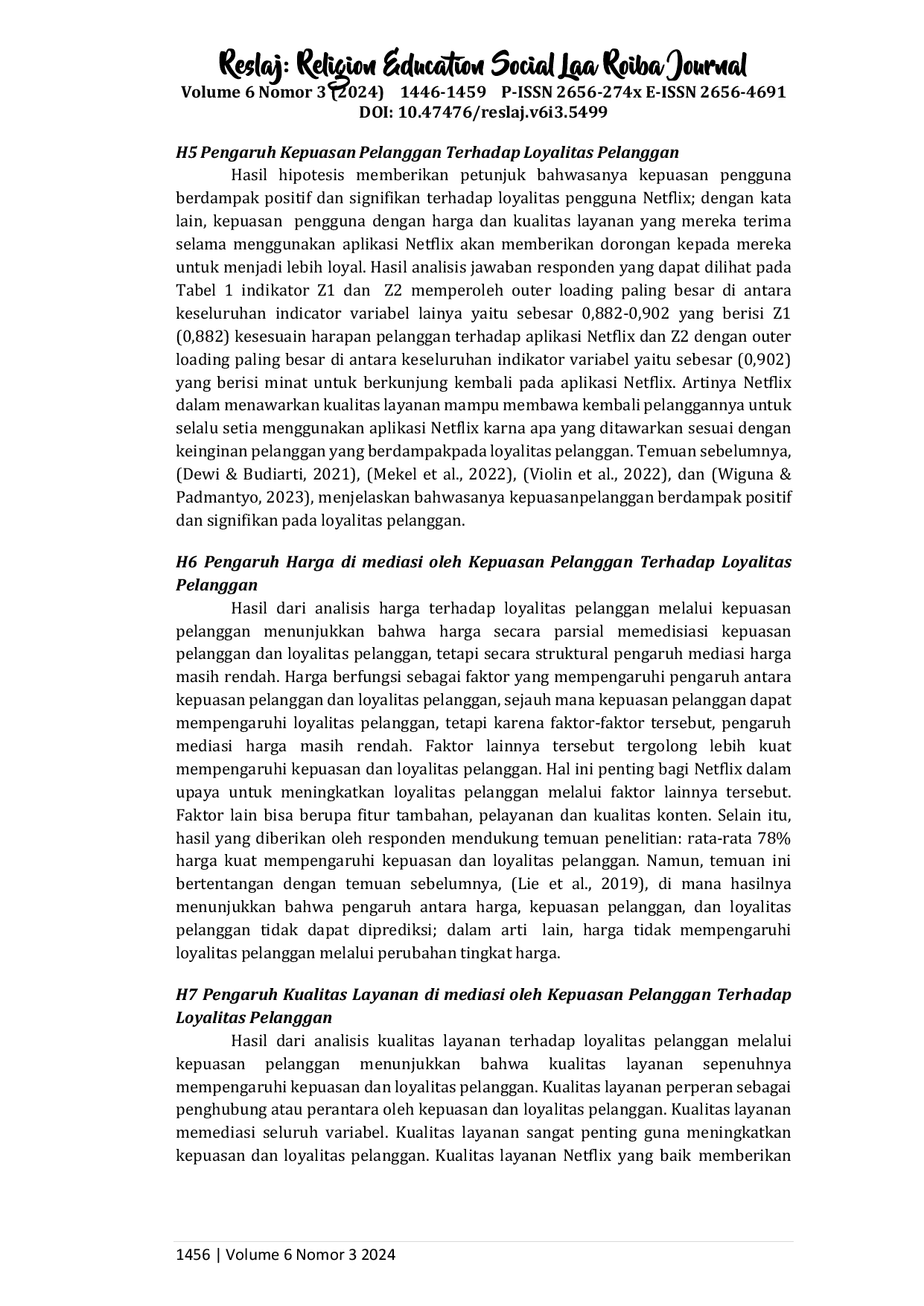 Reslaj : Religion Education Social Laa Roiba JournalReslaj : Religion Education Social Laa Roiba JournalTujuan penelitian ini adalah untuk memberikan pengetahuan tentang hubungan antara harga dan kualitas layanan terhadap loyalitas pelanggan melalui kepuasan pelanggan pada pengguna Netflix. Metode yang digunakan ialah metode purposive sampling dengan jumlah sampel 206 orang pengguna aplikasi streaming Netflix ber usia 17-25 tahun yang berfokus di kota Bengkulu. Penelitian menggunakan SEM dengan salah satu metode PLS menggunakan software smartpls 4.0 untuk mendapatkan pemahaman yang lebih rinci tentang perspektif responden. Sesuai dengan hasil pengujian statistik, harga berhubungan secara signifikan terhadap kepuasan pelanggan meskipun rendah. Adapun kualitas layanan juga berhubungan secara positif terhadap loyalitas pelanggan, begitu pun dengan kepuasan pelanggan terhadap loyalitas pelanggan. Untuk pengujian mediasi menggunakan metode efek upsilon v. Harga secara parsial memedisiasi kepuasan pelanggan dan loyalitas pelanggan namun secara level structural pengaruh mediasi masih tergolong rendah. Sedangkan pengaruh mediasi kualitas layanan secara full memedisiasi kepuasan pelanggan dan loyalitas pelanggan.