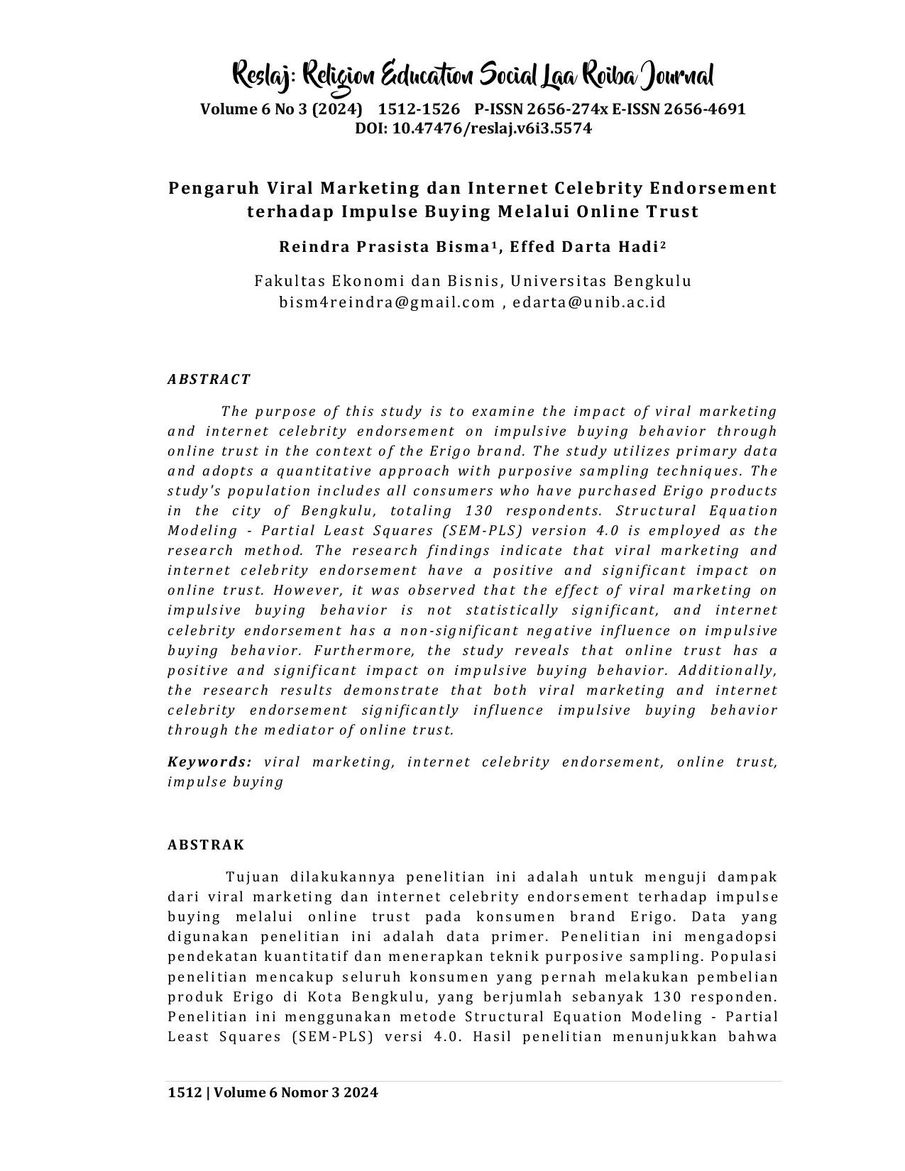 Reslaj : Religion Education Social Laa Roiba JournalReslaj : Religion Education Social Laa Roiba JournalTujuan dari penelitian ini adalah untuk menguji dampak dari viral marketing dan internet celebrity endorsement terhadap impulse buying melalui online trust pada konsumen brand Erigo. Data yang digunakan penelitian ini adalah data primer. Penelitian ini mengadopsi pendekatan kuantitatif dan menerapkan teknik positive sampling. Populasi penelitian mencakup seluruh konsumen yang pernah melakukan pembelian produk Erigo di Kota Bengkulu, berjumlah 130 responden. Penelitian ini menggunakan metode Structural Equation Modeling - Partial Least Squares (SEM-PLS) versi 4.0. Hasil penelitian menunjukkan bahwa viral marketing dan internet celebrity endorsement memiliki dampak positif dan signifikan terhadap online trust. Namun, terdapat temuan bahwa pengaruh viral marketing terhadap perilaku impulse buying tidak signifikan, dan internet celebrity endorsement memiliki pengaruh negatif yang juga tidak signifikan terhadap perilaku impulse buying. Selain itu, ditemukan bahwa online trust memiliki dampak positif dan signifikan terhadap perilaku impulse buying. Selanjutnya, hasil penelitian juga mengungkap bahwa viral marketing dan internet celebrity endorsement memiliki pengaruh positif yang signifikan terhadap perilaku impulse buying melalui mediator online trust.