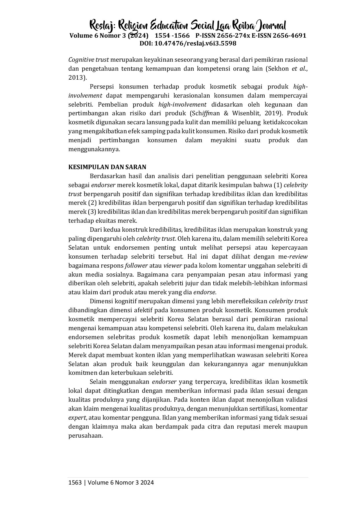 Penelitian ini menyimpulkan bahwa celebrity trust memiliki pengaruh positif dan signifikan terhadap kredibilitas iklan dan merek.Selain itu, kredibilitas iklan juga berpengaruh positif dan signifikan terhadap kredibilitas merek, serta keduanya secara bersamaan berpengaruh positif dan signifikan terhadap ekuitas merek.Pemilihan selebriti yang terpercaya sangat berkaitan dengan nilai-nilai iklan dan kredibilitas merek, serta kualitas produk menjadi faktor penting dalam membangun ekuitas merek.
