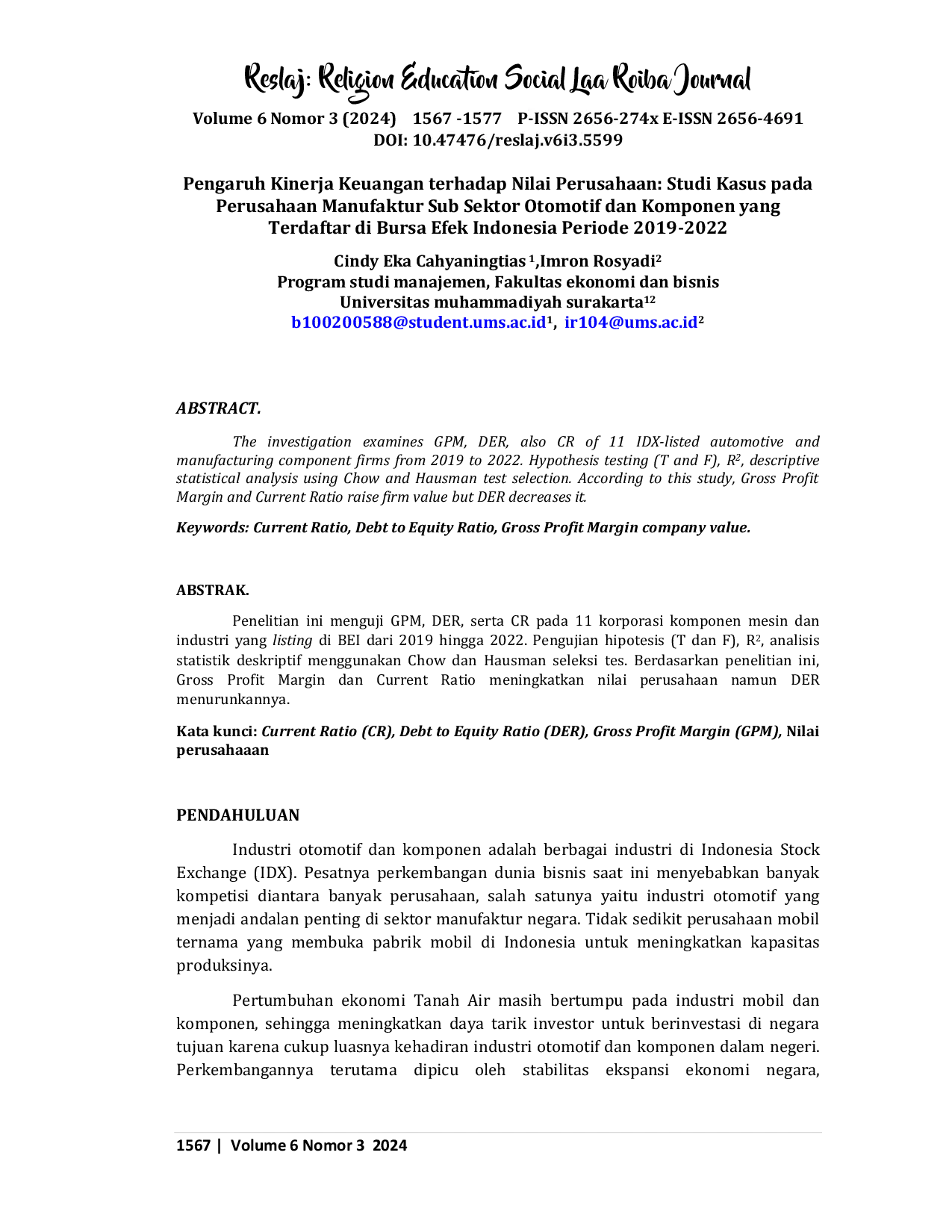 Reslaj : Religion Education Social Laa Roiba JournalReslaj : Religion Education Social Laa Roiba JournalPenelitian ini menguji GPM, DER, serta CR pada 11 korporasi komponen mesin dan industri yang listing di BEI dari 2019 hingga 2022. Pengujian hipotesis (T dan F), R2, analisis statistik deskriptif menggunakan Chow dan Hausman seleksi tes. Berdasarkan penelitian ini, Gross Profit Margin dan Current Ratio meningkatkan nilai perusahaan namun DER menurunkannya.