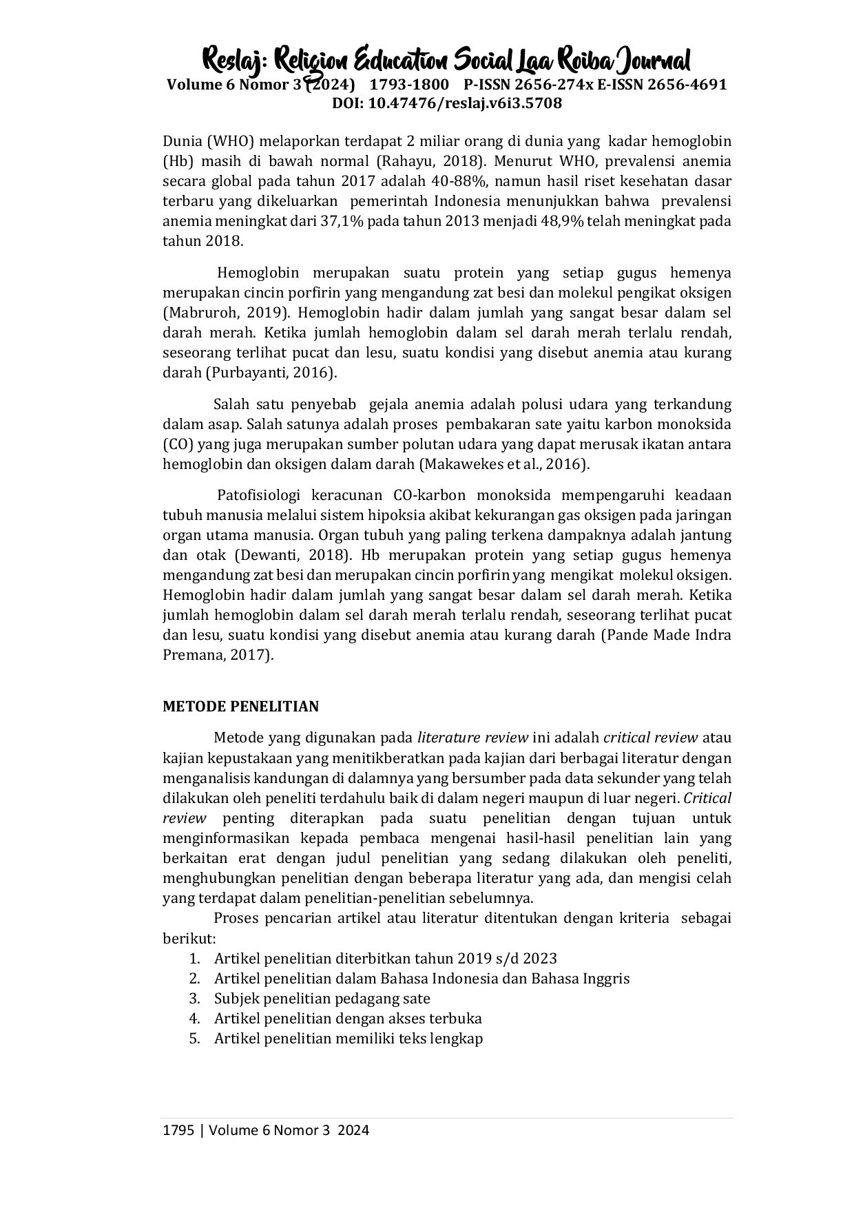 Reslaj : Religion Education Social Laa Roiba JournalReslaj : Religion Education Social Laa Roiba JournalAsap sate mengandung polutan yang bernama karbon monoksida (CO). Karbon monoksida (CO) merupakan zat yang tidak berwarna dan tidak berbau, tetapi mengandung racun yang dapat berdampak buruk bagi kesehatan manusia khususnya akan berpengaruh pada kadar hemoglobin pada tubuh. Tinjauan sistematis pada literature review ini bertujuan untuk menggambarkan kadar hemoglobin dan karbon monoksida (CO) pada pedagang sate. Penelitian ini merupakan literature review, sehingga data base yang digunakan dalam pencarian artikel ini menggunakan sumber sekunder yang berasal dari Google Scholar dan sage publication dengan kata kunci hemoglobin, karbon monoksida, Carbon Monoxide (CO) yang telah dilakukan peneliti sebelumnya baik yang ada di dalam negeri maupun di luar negeri. Dari total 300 artikel, akhirnya diperoleh 5 artikel yang relevan dengan judul yang dibuat oleh peneliti. Dari 5 artikel pilihan tersebut diperoleh data bahwa zat yang terdapat pada asap sate memiliki pengaruh terhadap kadar hemoglobin dalam tubuh. Semakin lama terpapar asap maka berisiko tinggi kadar hemoglobin pada tubuh penjual sate akan semakin menurun. Hal ini tentu tidak baik bagi kesehatan tubuh. Oleh sebab itu penjual sate disarankan menggunakan APD (Alat Pelindung Diri) berupa masker untuk meminimalisir penyerapan zat yang terkandung dalam asap sate. Karbon monoksida (CO) dapat memengaruhi kadar hemoglobin pada tubuh pedagang sate.