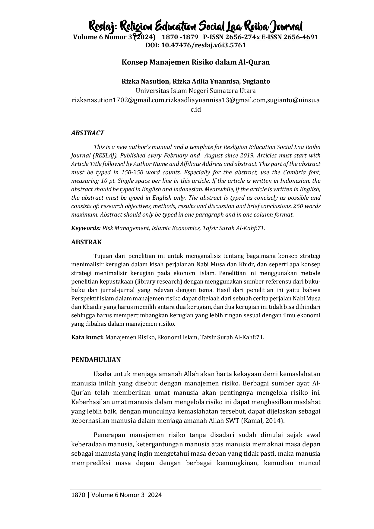 Reslaj : Religion Education Social Laa Roiba JournalReslaj : Religion Education Social Laa Roiba JournalTujuan dari penelitian ini untuk menganalisis tentang bagaimana konsep strategi menimalisir kerugian dalam kisah perjalanan Nabi Musa dan Khidr, dan seperti apa konsep strategi menimalisir kerugian pada ekonomi islam. Penelitian ini menggunakan metode penelitian kepustakaan (library research) dengan menggunakan sumber referensu dari buku-buku dan jurnal-jurnal yang relevan dengan tema. Hasil dari penelitian ini yaitu bahwa Perspektif islam dalam manajemen risiko dapat ditelaah dari sebuah cerita perjalan Nabi Musa dan Khaidir yang harus memilih antara dua kerugian, dan dua kerugian ini tidak bisa dihindari sehingga harus mempertimbangkan kerugian yang lebih ringan sesuai dengan ilmu ekonomi yang dibahas dalam manajemen risiko.