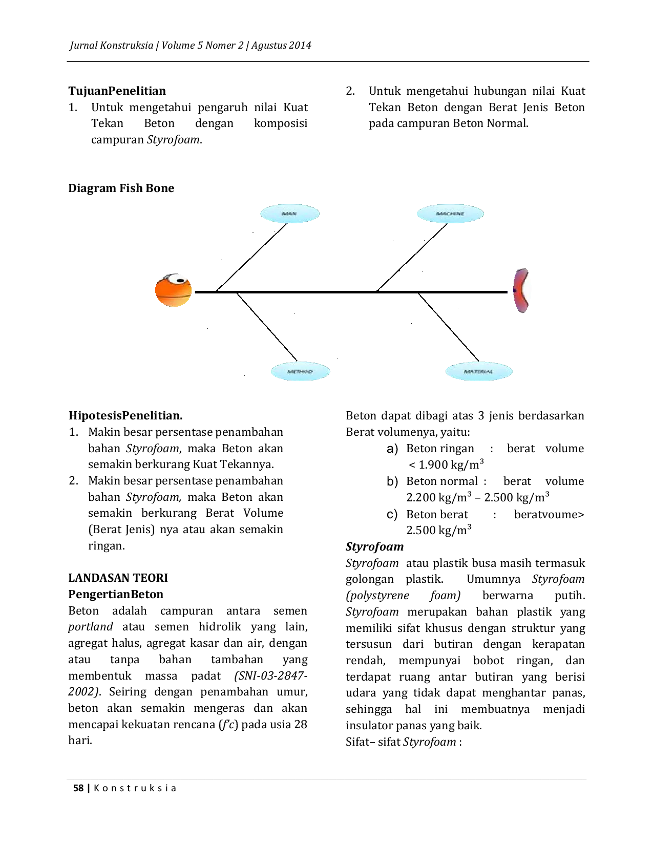 KonstruksiaKonstruksiaBeton merupakan material yang umum digunakan untuk Struktur. Hal ini disebabkan karena Beton mempunyai banyak keunggulan jika dibandingkan dengan bahan bangunan lainnya. Namun demikian beton memiliki salah satu kelemahan yaitu berat jenisnya cukup tinggi sehingga beban mati pada suatu struktur menjadi besar. Beberapa metode dapat digunakan untuk mengurangi berat jenis beton ini, diantaranya adalah dengan memakai agregat ringan. Salah satu metode untuk menjadikan Beton ringan adalah dengan penambahan bahan limbah Styrofoam. Namun pengurangan berat jenis ini tidak diikuti dengan penambahan kuat tekan Beton, sehingga sampai saat ini beton ringan dengan menggunakan styrofoam hanya dipakai untuk bagian non Struktur. Untuk maksud tersebut, maka penelitian ini dibuat untuk mengetahui seberapa besar pengaruh Styrofoam sebagai pengganti agregat kasar pada Beton Normal dengan persentase penambahan Styrofoam sebesar 1%, 2% dan 3% dari berat campuran Beton Normal. Hasil penelitian yang dilakukan didapat bahwa pada penambahan 1% stryofoam akan menurunkan berat volume beton rata-rata sebesar 12% dengan rincian campuran 1% (turun 13%) , 2% (turun 22%) , 3% (turun 32%). Selain hal tersebut penambahan stryofoam pada beton menurunkan kuat tekan beton normal. Untuk penambahan Styrofoamsebesar 1% terjadi penurunan 54%, 2% sebesar 57% dan 3% sebesar 87%.