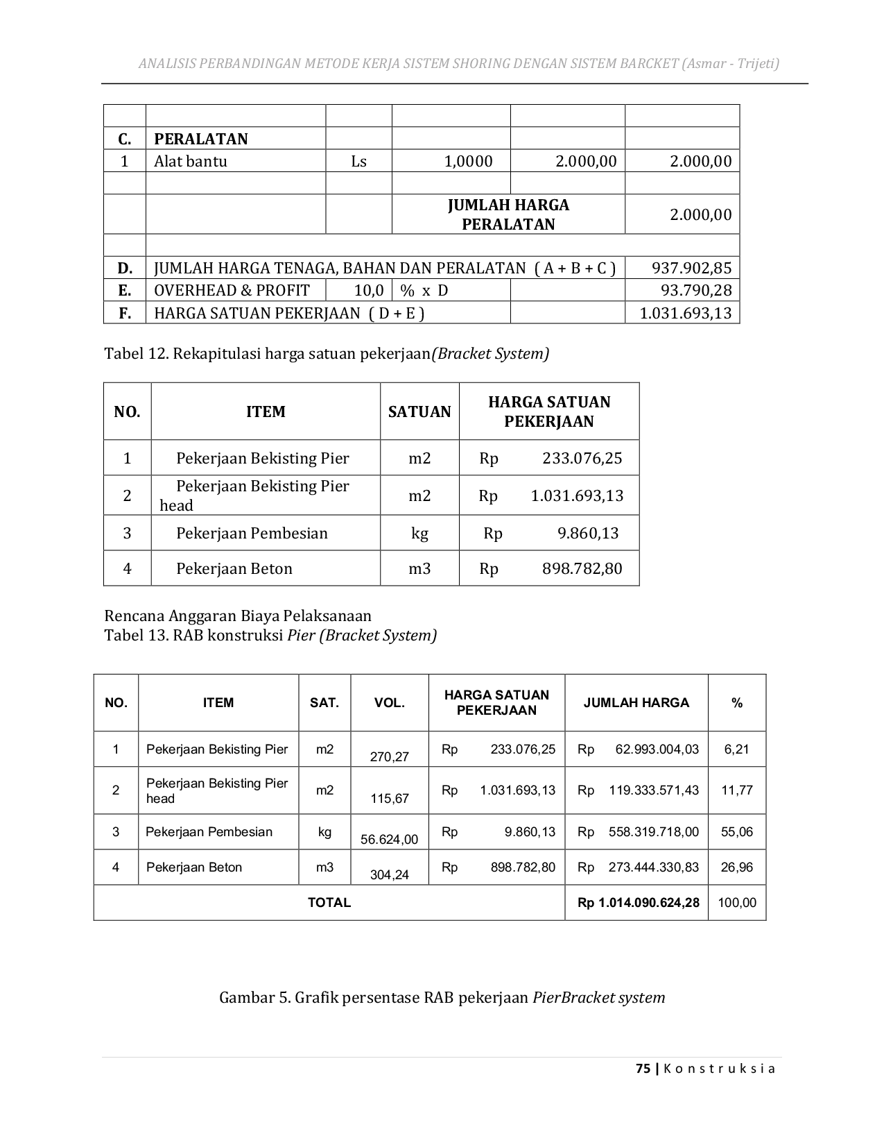 KonstruksiaKonstruksiaPada Proyek New Access Road terdapat beberapa jenis konstruksi salah satunya adalah Jembatan pada STA 0 937,32 sampai dengan 1 173,123. Jembatan ini akan dibangun dengan ketinggian pier 22 meter dan terletak pada sungai yang rawan banjir. Terdapat 5 pier pada jembatan tersebut, namun hanya beberapa pier yang tingkat resiko dalam pengerjaan pier head-nya tidak terlalu besar, hanya bekerja di ketinggian saja, pihak kontraktor dapat mengatasinya dengan metode kerja sistem shoring, namun pada pier P4 dan P5 resikonya terlalu besar karena banjir yang akan terjadi ditakutkan akan menghanyutkan perancah shoring tersebut. Oleh karena itu pada pier tersebut digunakan sistem bracket untuk penopang bekisting pier head selama proses konstruksi berlangsung. Seiring perjalanan waktu, dibutuhkan analisa biaya dan waktu pelaksanaan yang tepat dari kedua metode yang dipakai, untuk kedepannya pada proyek-proyek berikutnya dapat dipakai metode kerja yang efisien dalam biaya dan efektif dalam waktu pelaksanaannya. Dari analisa didapatkan bahwa metode dengan sistem bracket lebih mahal yaitu sebesar Rp. 1.014.090.624 dibandingkan dengan sistem Shoring yaitu sebesar Rp. 955.918.664. Dengan selisih biaya sebesar Rp. 58.171.960, maka sistem Shoring memiliki efisiensi sebesar 5,74 % dibandingkan dengan sistem Bracket Truss.