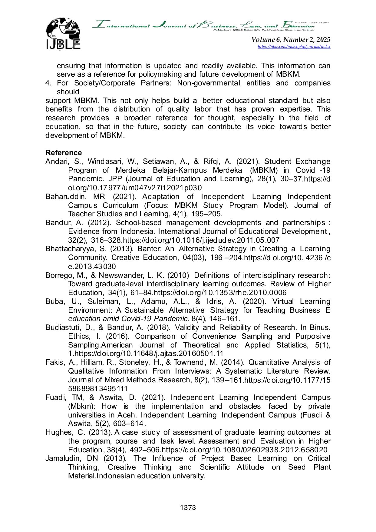 International Journal of Business, Law, and EducationInternational Journal of Business, Law, and EducationPenelitian ini bertujuan untuk menilai efektivitas program Merdeka Belajar Kampus Merdeka (MBKM) dalam meningkatkan kesiapan kerja lulusan dari Fakultas Pendidikan, Universitas Negeri Jakarta (FIP UNJ). Dengan menggunakan pendekatan penelitian kuantitatif, studi ini memanfaatkan metode survei dengan data dikumpulkan melalui kuesioner terstruktur yang didistribusikan melalui Google Forms. Instrumen, yang dikembangkan menggunakan skala Likert, diberikan kepada sampel 323 mahasiswa FIP UNJ yang dipilih melalui teknik sampling acak proporsional untuk memastikan representasi berdasarkan struktur populasi. Temuan menunjukkan bahwa mahasiswa memiliki persepsi positif terhadap program MBKM. Program ini dianggap sebagai alat yang efektif dalam memperkuat pembelajaran berbasis pengalaman, meningkatkan keterampilan keras dan lunak, serta mempersiapkan mereka untuk dunia profesional. Program ini telah berkontribusi signifikan dalam menyelaraskan hasil pendidikan tinggi dengan tuntutan pasar tenaga kerja, sehingga meningkatkan kualitas keseluruhan lulusan.