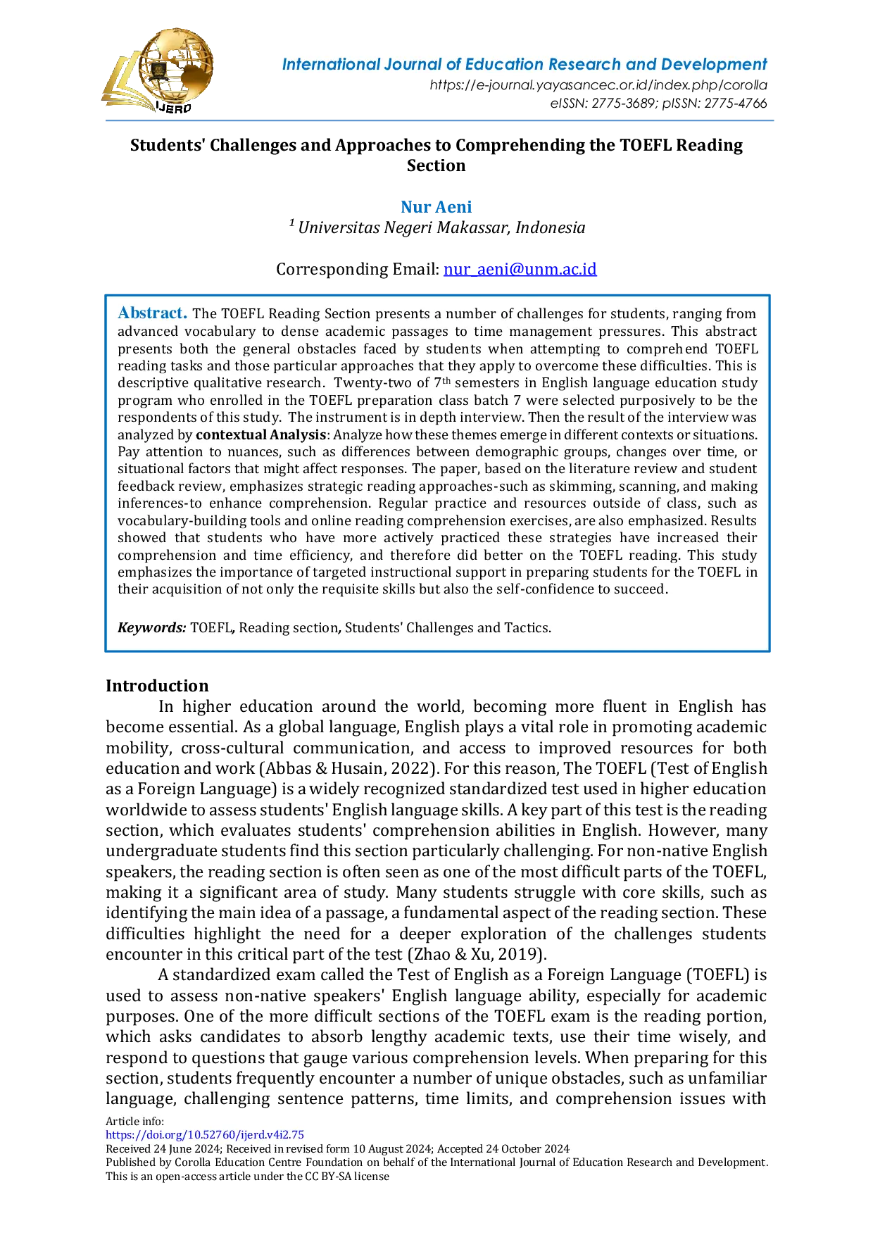 COROLLACOROLLATOEFL Reading Section menyajikan berbagai tantangan bagi mahasiswa, mulai dari kosakata tingkat lanjut hingga paragraf akademik yang padat hingga tekanan manajemen waktu. Abstrak ini menyajikan rintangan umum yang dihadapi oleh mahasiswa saat mencoba memahami tugas membaca TOEFL dan pendekatan khusus yang mereka terapkan untuk mengatasi kesulitan tersebut. Penelitian ini adalah penelitian kualitatif deskriptif. Dua puluh dua mahasiswa semester 7 di program studi pendidikan bahasa Inggris yang terdaftar di kelas persiapan TOEFL batch 7 dipilih secara purposif sebagai responden penelitian ini. Instrumen penelitian adalah wawancara mendalam. Kemudian hasil wawancara dianalisis menggunakan analisis kontekstual: menganalisis bagaimana tema-tema tersebut muncul dalam konteks atau situasi yang berbeda. Perhatikan nuansa, seperti perbedaan antara kelompok demografi, perubahan sepanjang waktu, atau faktor situasional yang mungkin mempengaruhi respons. Artikel ini, berdasarkan tinjauan literatur dan tinjauan umpan balik mahasiswa, menekankan pendekatan membaca strategis - seperti skimming, scanning, dan membuat inferensi - untuk meningkatkan pemahaman. Latihan teratur dan sumber di luar kelas, seperti alat pembangun kosakata dan latihan pemahaman membaca daring, juga ditekankan. Hasil menunjukkan bahwa mahasiswa yang telah berlatih secara aktif strategi ini telah meningkatkan pemahaman dan efisiensi waktu mereka, dan karena itu melakukan lebih baik dalam membaca TOEFL. Penelitian ini menekankan pentingnya dukungan instruksional yang ditargetkan dalam mempersiapkan mahasiswa untuk TOEFL dalam akuisisi mereka tidak hanya keterampilan yang diperlukan tetapi juga kepercayaan diri untuk berhasil.