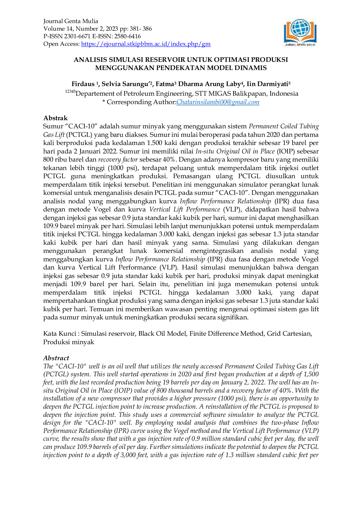 Jurnal Genta MuliaJurnal Genta MuliaSumur CACI-10 adalah sumur minyak yang menggunakan sistem Permanent Coiled Tubing Gas Lift (PCTGL) yang baru diakses. Sumur ini mulai beroperasi pada tahun 2020 dan pertama kali berproduksi pada kedalaman 1.500 kaki dengan produksi terakhir sebesar 19 barel per hari pada 2 Januari 2022. Sumur ini memiliki nilai In-situ Original Oil in Place (IOIP) sebesar 800 ribu barel dan recovery factor sebesar 40%. Dengan adanya kompresor baru yang memiliki tekanan lebih tinggi (1000 psi), terdapat peluang untuk memperdalam titik injeksi outlet PCTGL guna meningkatkan produksi. Pemasangan ulang PCTGL diusulkan untuk memperdalam titik injeksi tersebut. Penelitian ini menggunakan simulator perangkat lunak komersial untuk menganalisis desain PCTGL pada sumur CACI-10. Dengan menggunakan analisis nodal yang menggabungkan kurva Inflow Performance Relationship (IPR) dua fasa dengan metode Vogel dan kurva Vertical Lift Performance (VLP), didapatkan hasil bahwa dengan injeksi gas sebesar 0.9 juta standar kaki kubik per hari, sumur ini dapat menghasilkan 109.9 barel minyak per hari. Simulasi lebih lanjut menunjukkan potensi untuk memperdalam titik injeksi PCTGL hingga kedalaman 3.000 kaki, dengan injeksi gas sebesar 1.3 juta standar kaki kubik per hari dan hasil minyak yang sama. Simulasi yang dilakukan dengan menggunakan perangkat lunak komersial mengintegrasikan analisis nodal yang menggabungkan kurva Inflow Performance Relationship (IPR) dua fasa dengan metode Vogel dan kurva Vertical Lift Performance (VLP). Hasil simulasi menunjukkan bahwa dengan injeksi gas sebesar 0.9 juta standar kaki kubik per hari, produksi minyak dapat meningkat menjadi 109.9 barel per hari. Selain itu, penelitian ini juga menemukan potensi untuk injeksi PCTGL hingga kedalaman 3.000 kaki, yang dapat memperdalam titik injeksi dan mempertahankan tingkat produksi yang sama dengan injeksi gas sebesar 1.3 juta standar kaki kubik per hari. Temuan ini memberikan wawasan penting mengenai optimasi sistem gas lift pada sumur minyak untuk meningkatkan produksi secara signifikan.